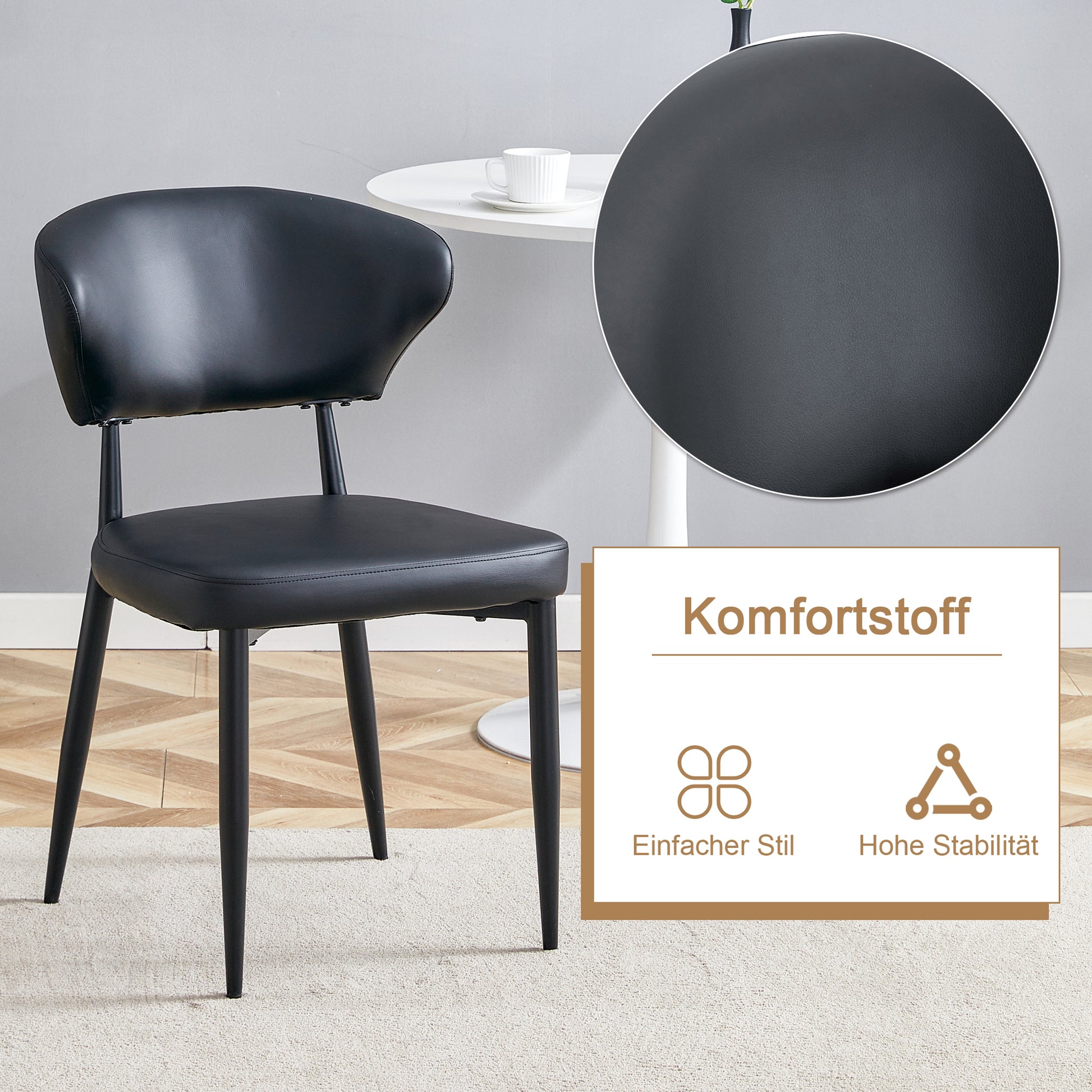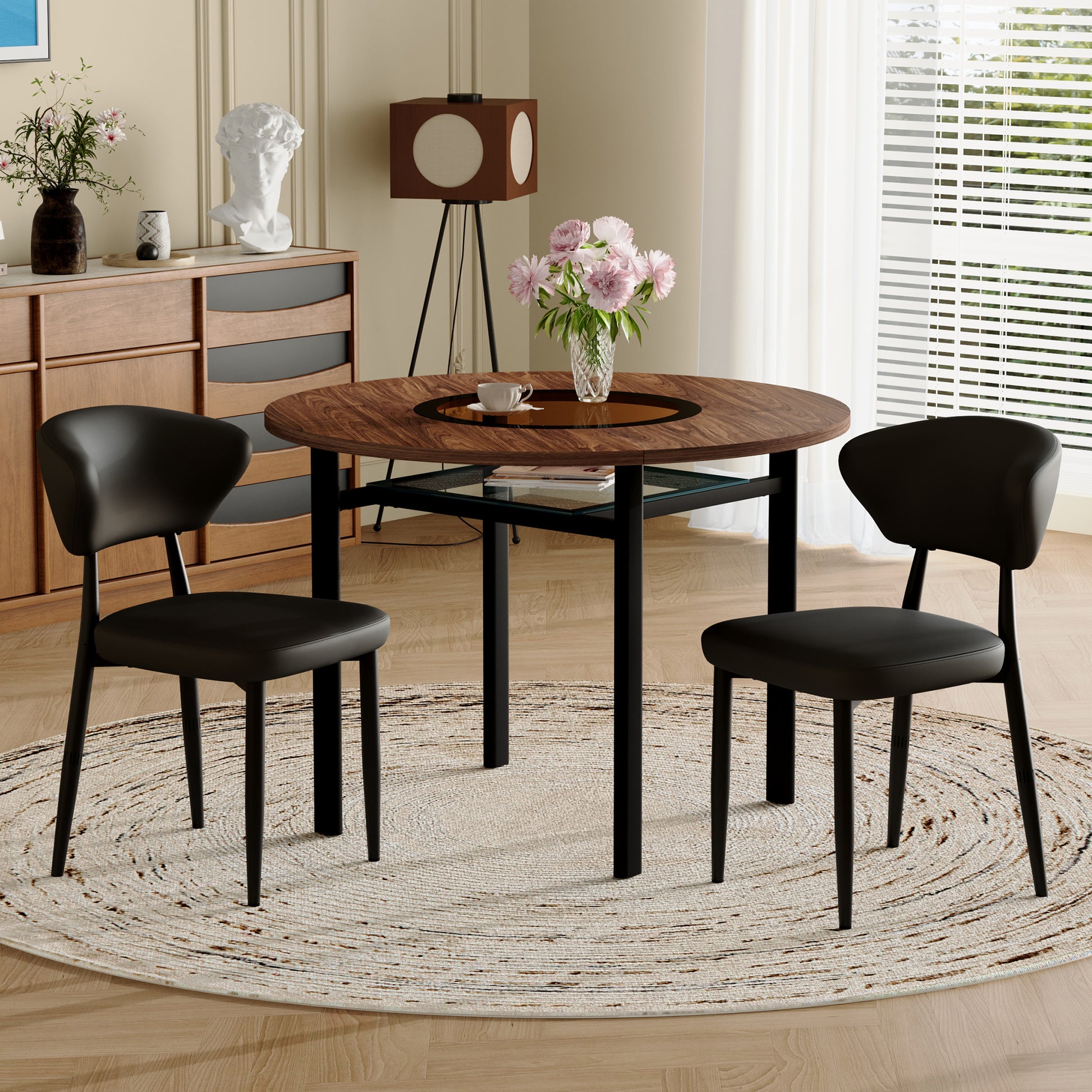 Modern Minimalist Round Table Set, 100cm Wood Look with 2 Armchairs, Black PU Leather