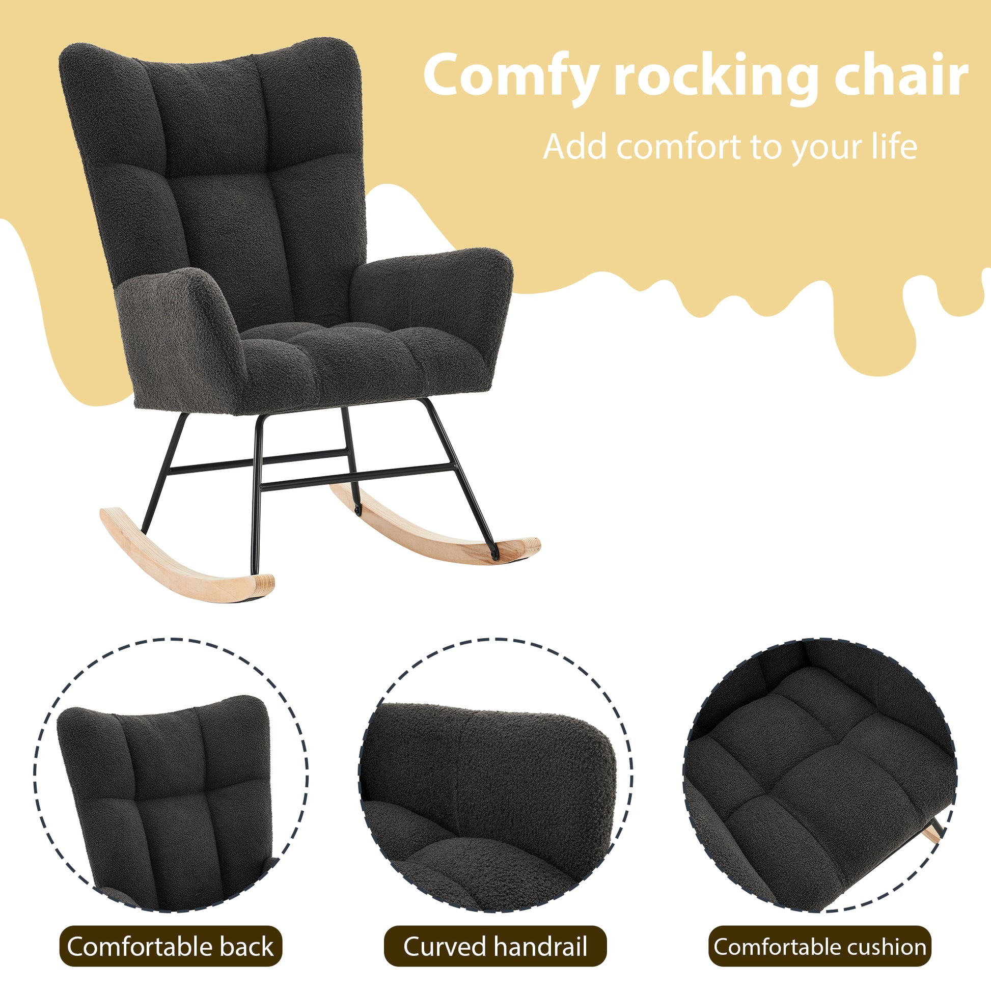 The high back and thick seat cushion are filled with sponge, which is soft, comfortable, elastic, and not easy to collapse. The whole recreational rocking chair is soft enough for you to enjoy yourself and relax your body after tired work.