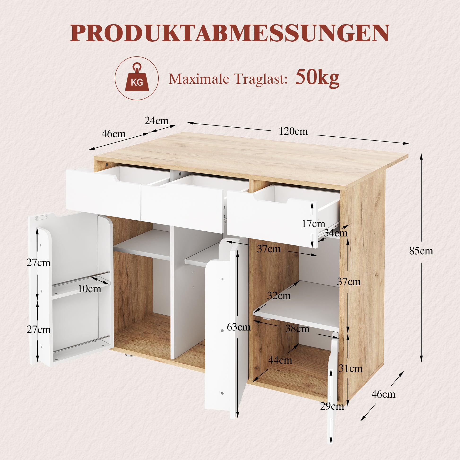 The robust construction proves its worth in daily use: drawers glide smoothly, doors close quietly, and the sturdy shelves reliably withstand frequent use. Whether in the kitchen, living room, study, or hallway, the cabinet remains stable and functional for years to come and will be a piece of furniture you appreciate for a long time.