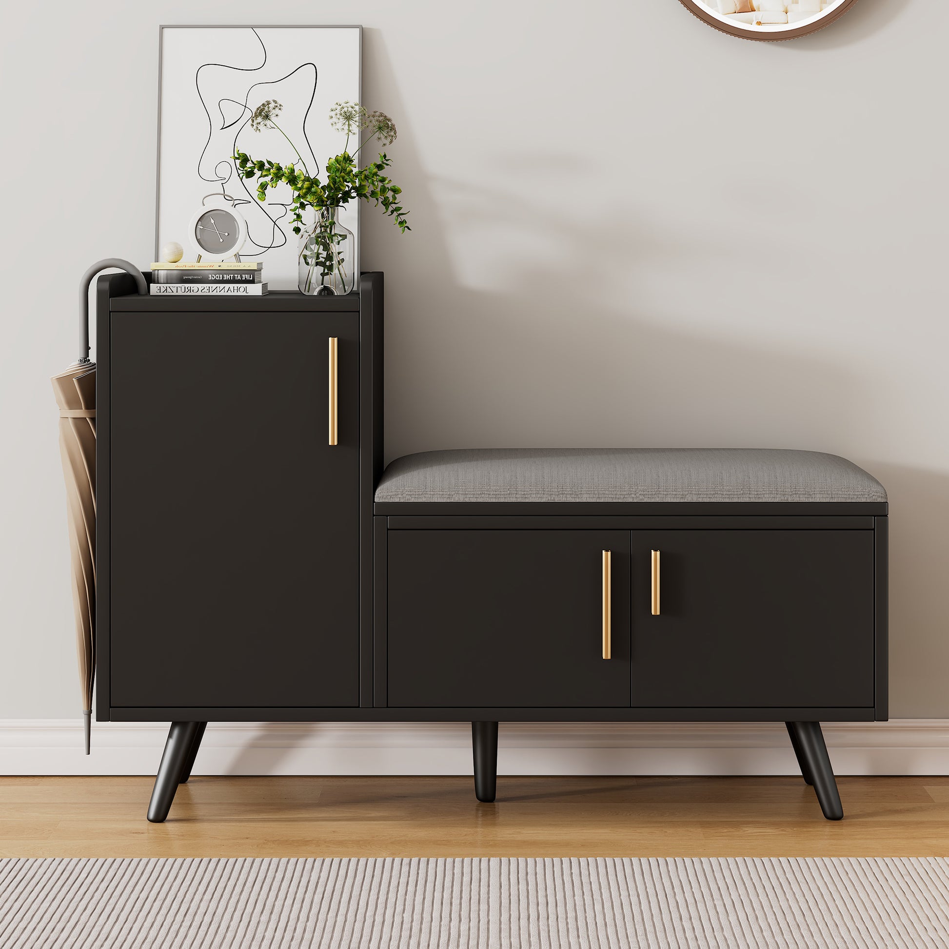 Modern shoe bench with three storage doors, multiple levels for storage