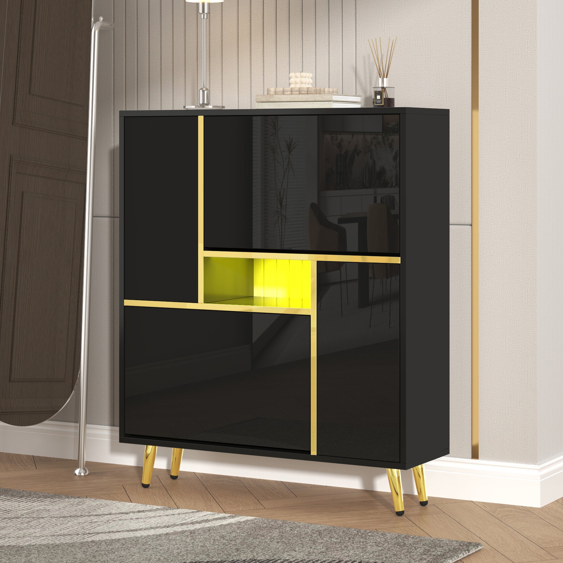 Modern shoe cabinet, high-gloss front, 16-color LED light, black