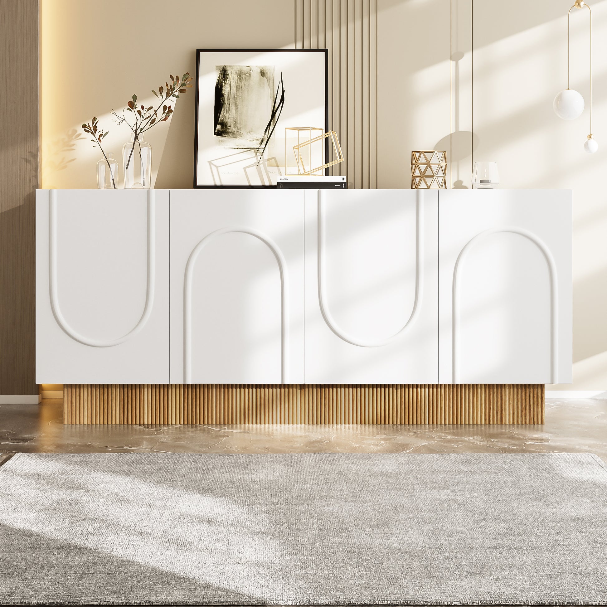 This modern sideboard combines aesthetic design with a functional structure, offering an elegant solution for everyday storage in living and dining areas. The front features four doors with a subtle, three-dimensional, U-shaped relief design. The soft, rounded lines give the piece a particularly harmonious and artistic effect, making it easy to integrate into modern or minimalist interior design concepts.