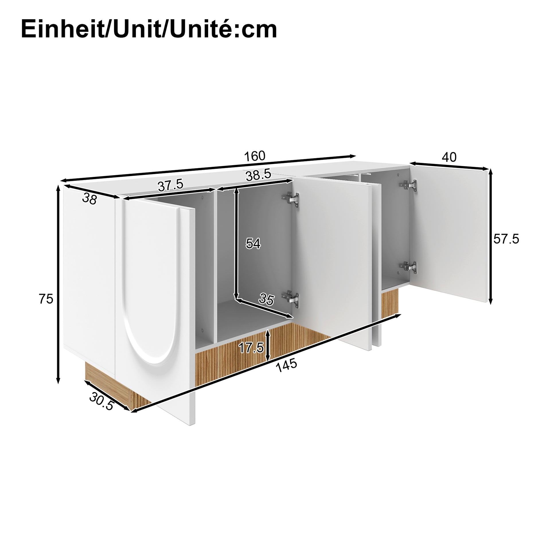 Measuring 160 x 75 x 38 cm, the sideboard offers ample storage space for a variety of uses. Inside, there are four separate compartments, each approximately 54 cm high. This is ideal for dishes, everyday items, supplies, files, or decorative pieces. The clear layout makes sorting easy and ensures that needed items are always within easy reach.