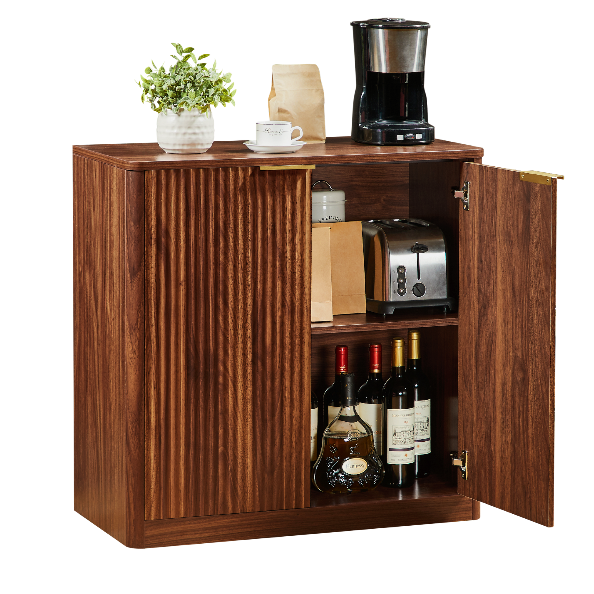 High-quality metal hinges ensure smooth and quiet door closing year after year. The vertical grooves and elegant, gold-colored handle give the sideboard a unique character and timeless feel.
