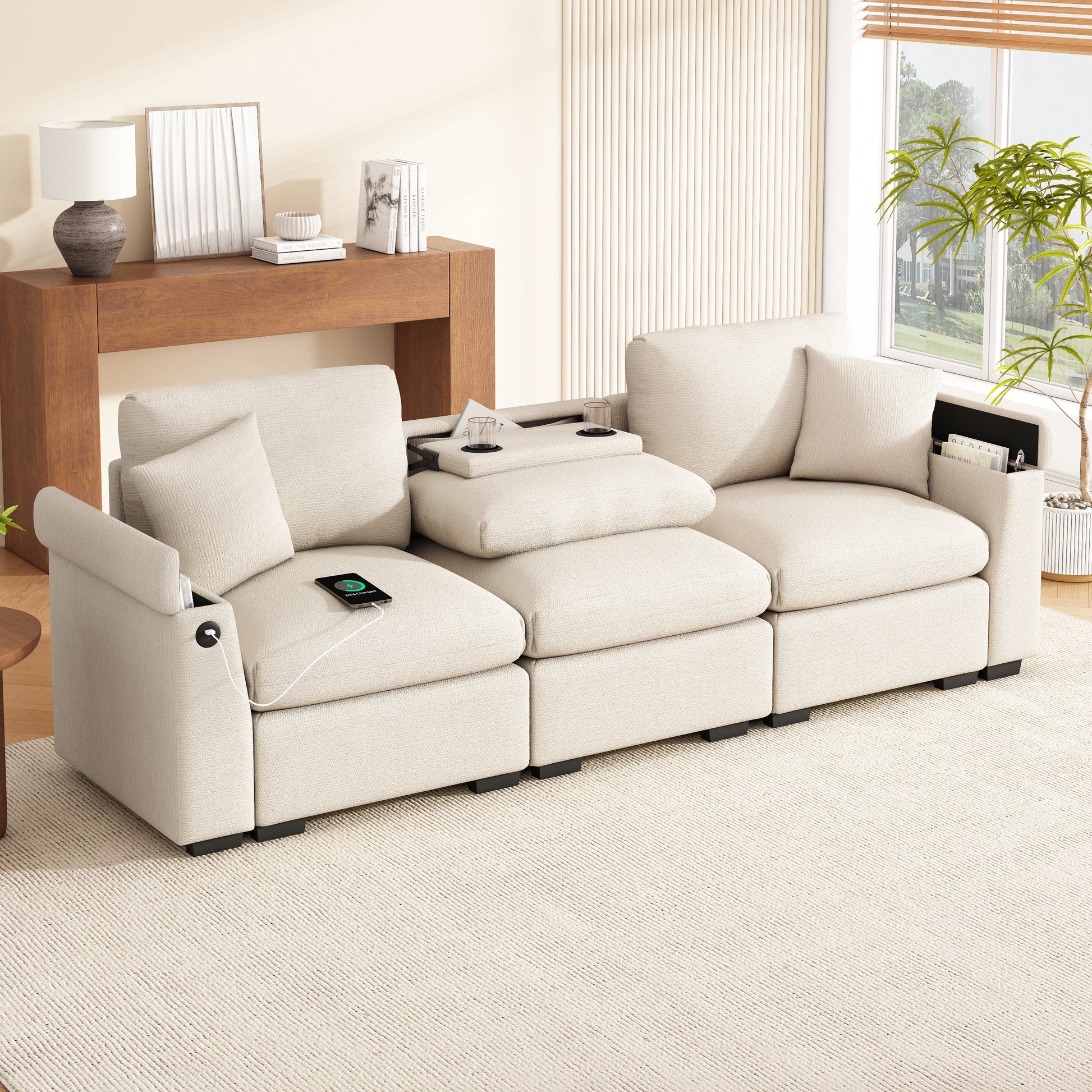 Modern Three-Seater Sofa, Folding Table USB Port Drink Holder Storage, Chenille