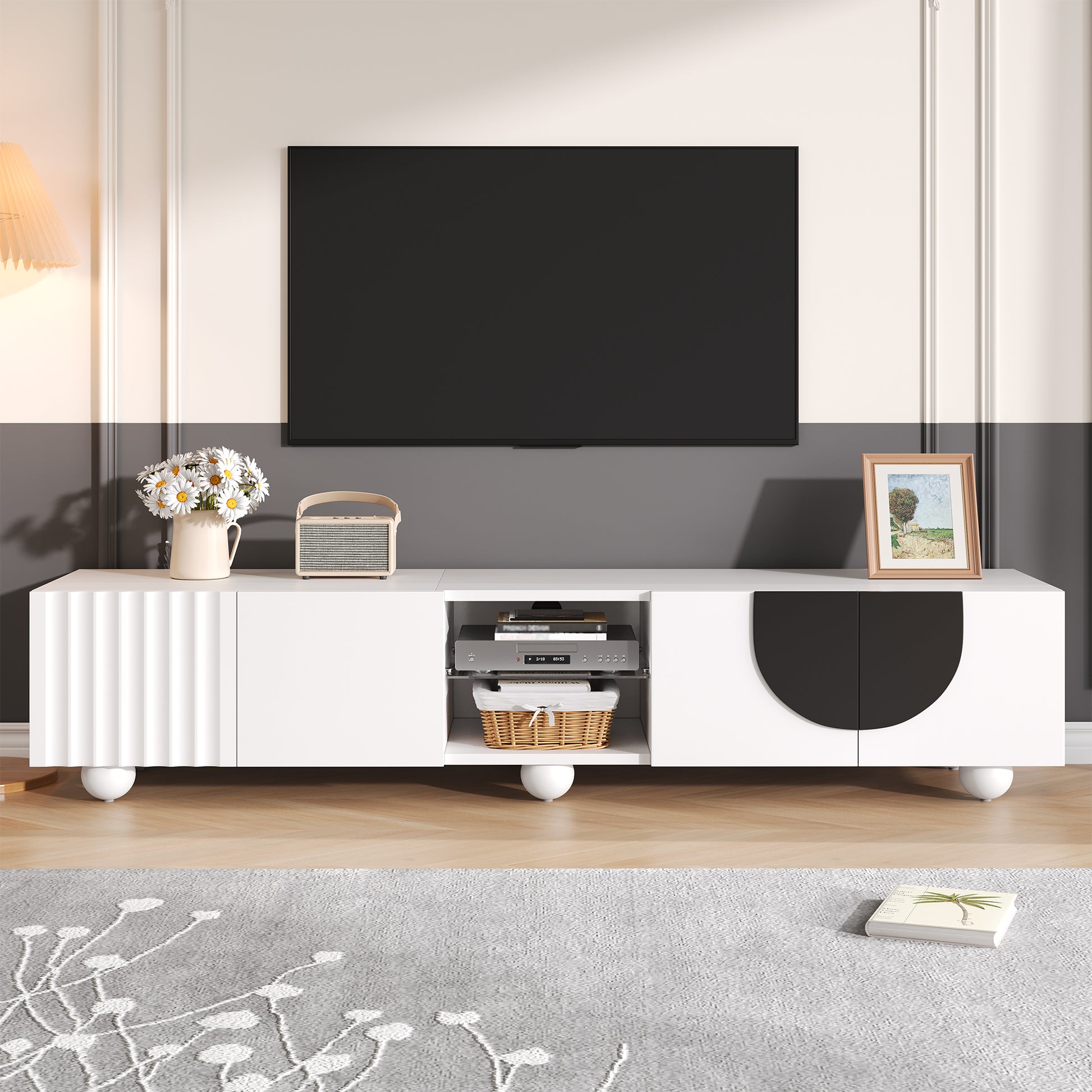 This modern, minimalist TV cabinet features a striking black and white design, creating a clean, uncluttered look that blends harmoniously into various living rooms. The cabinet doors utilize a push-to-open mechanism for smooth, secure, and handleless access. Closed cabinets on the sides conceal clutter for a tidy appearance.