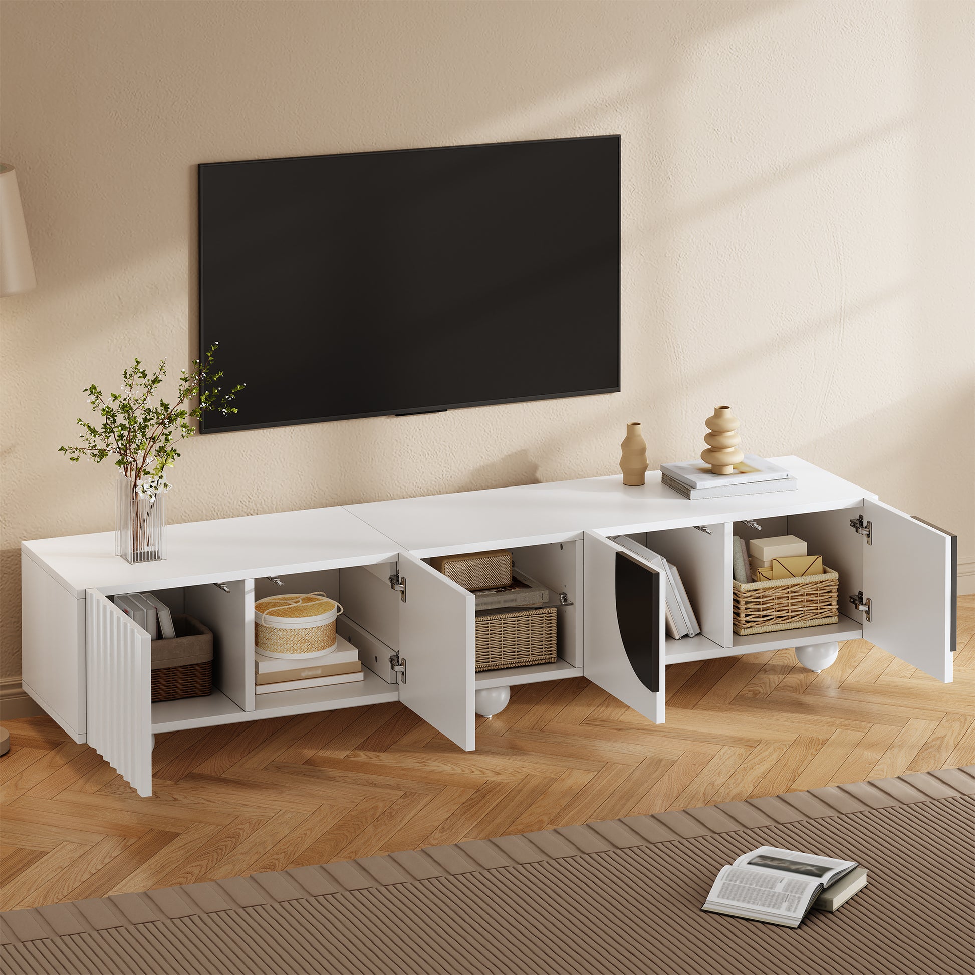 The open compartment in the center provides ideal space for set-top boxes, routers, speakers, and other devices, ensuring easy access and optimal ventilation. The flat, wide tabletop offers ample space for decorative items, picture frames, and speakers. Rounded feet guarantee stability and durability and facilitate easy cleaning. This TV cabinet not only meets your storage and placement needs but also adds a fresh and elegant touch to your living room.