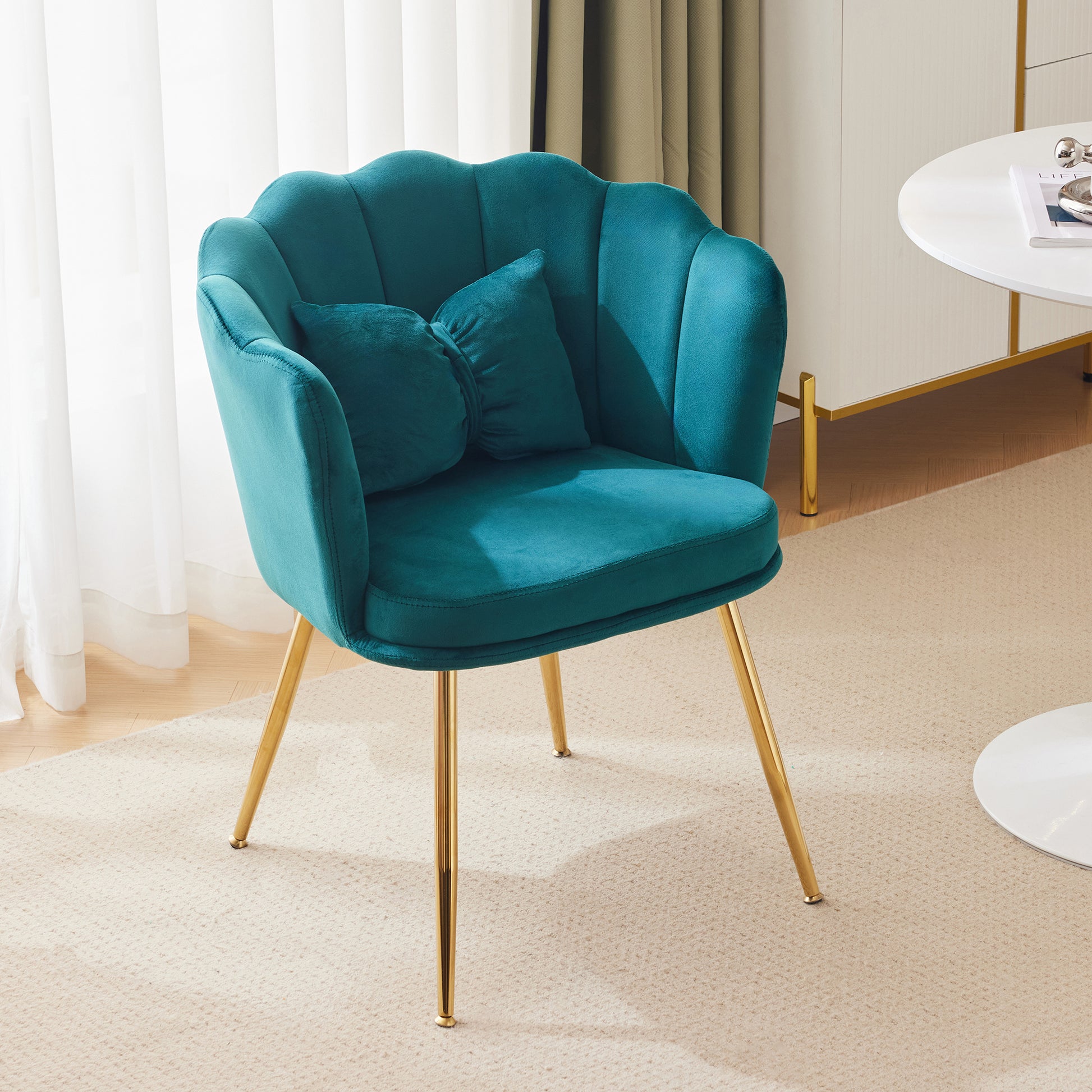Modern velvet armchair, comfortable upholstered with petal back, gold-plated metal legs and butterfly cushion