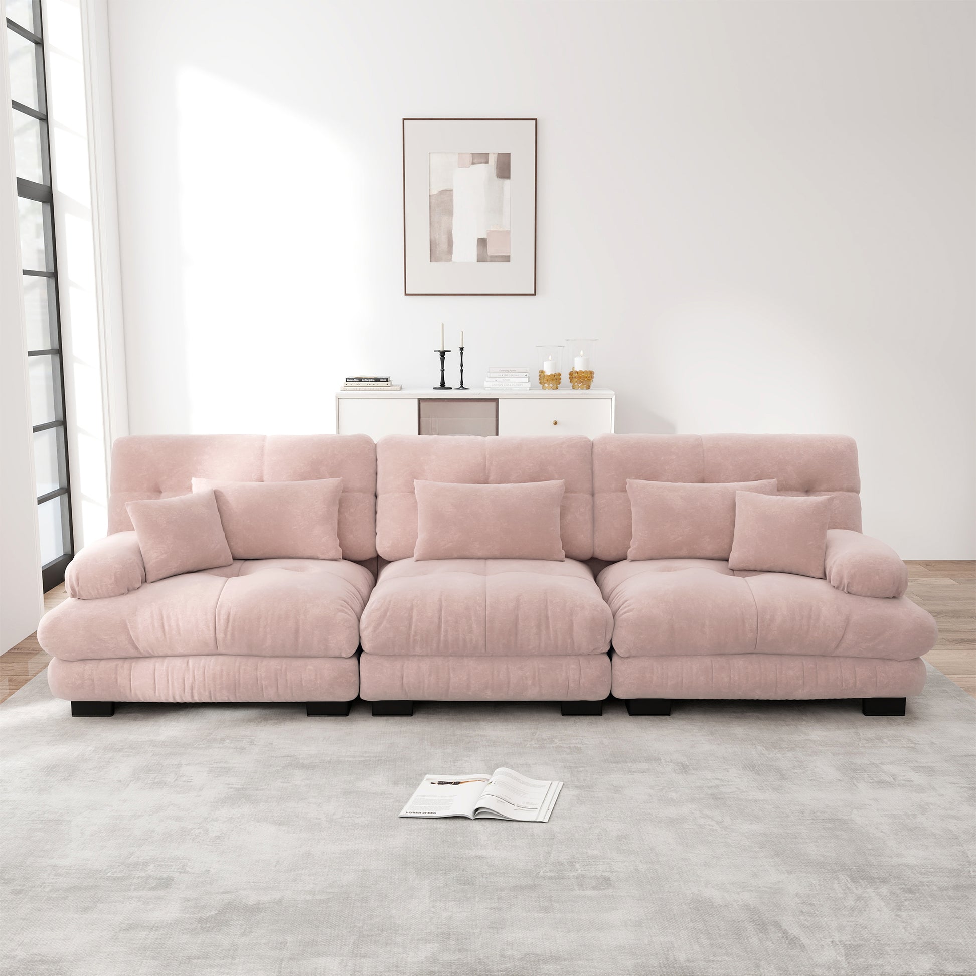 Cloud-shaped seat cushions, free of feathers or wood, offer excellent support and elasticity for your body. The deep seat provides additional support and comfort for the waist. Decorative pillows and lumbar cushions offer extra support. You can sit down and feel the sofa backrest adjust perfectly and supportively while enjoying unparalleled comfort. Whether watching TV, reading, or chatting with family, this sofa provides the ultimate comfort experience.
