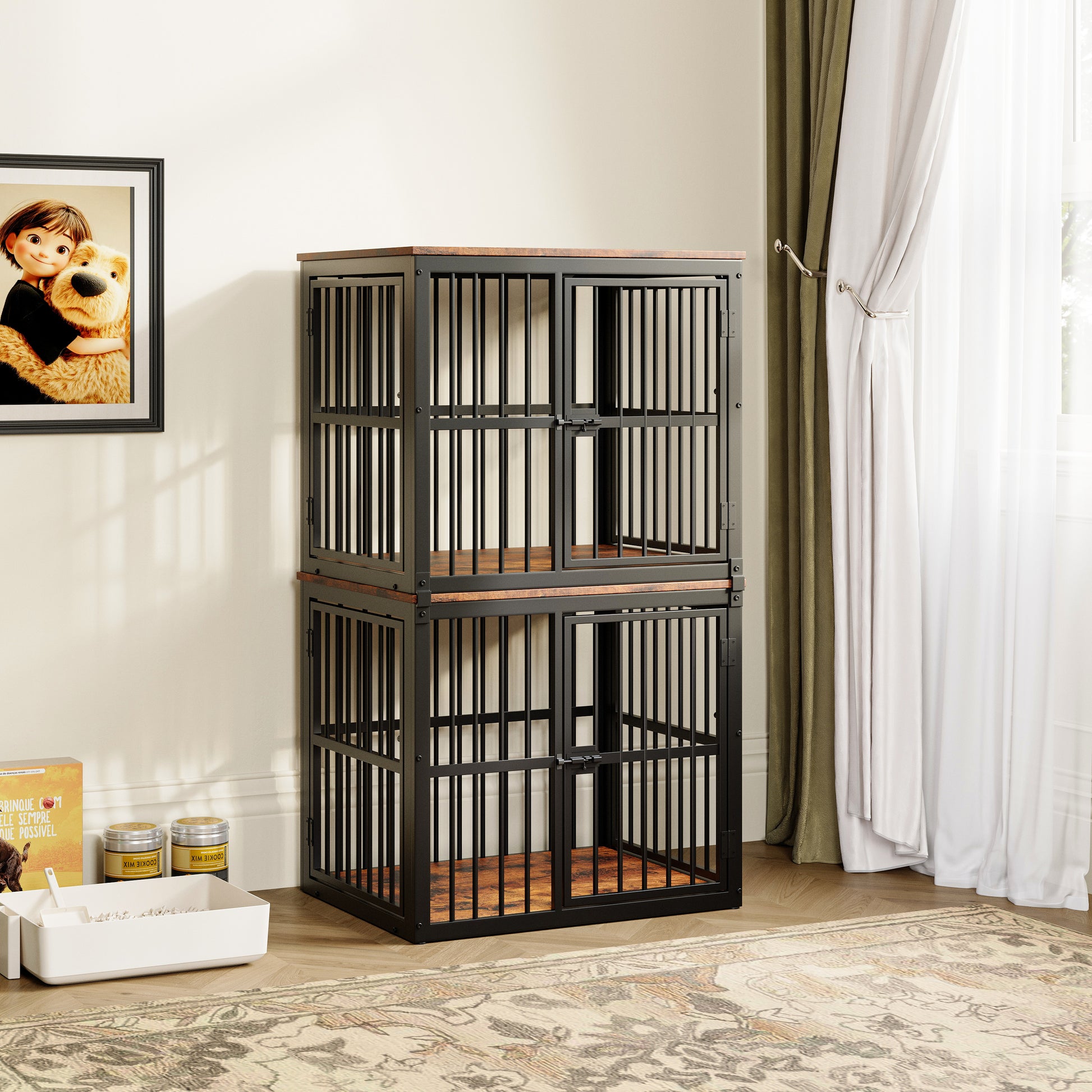 Two cages placed side-by-side provide two dogs with a shared, spacious living area. Perfect for harmonious cohabitation with separate entrances.
