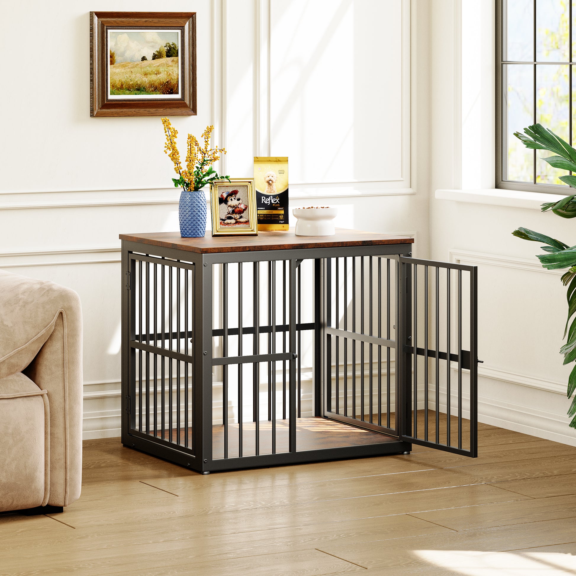 Dimensions: 68.4 x 53 x 61 cm (L x W x H). Net / Gross Weight: 16.2 kg / 18 kg. Materials: Particleboard, Iron. Scope of Delivery: 1 Furniture-Style Dog Crate, Assembly Parts, Assembly Instructions. Number of Packages: 1.