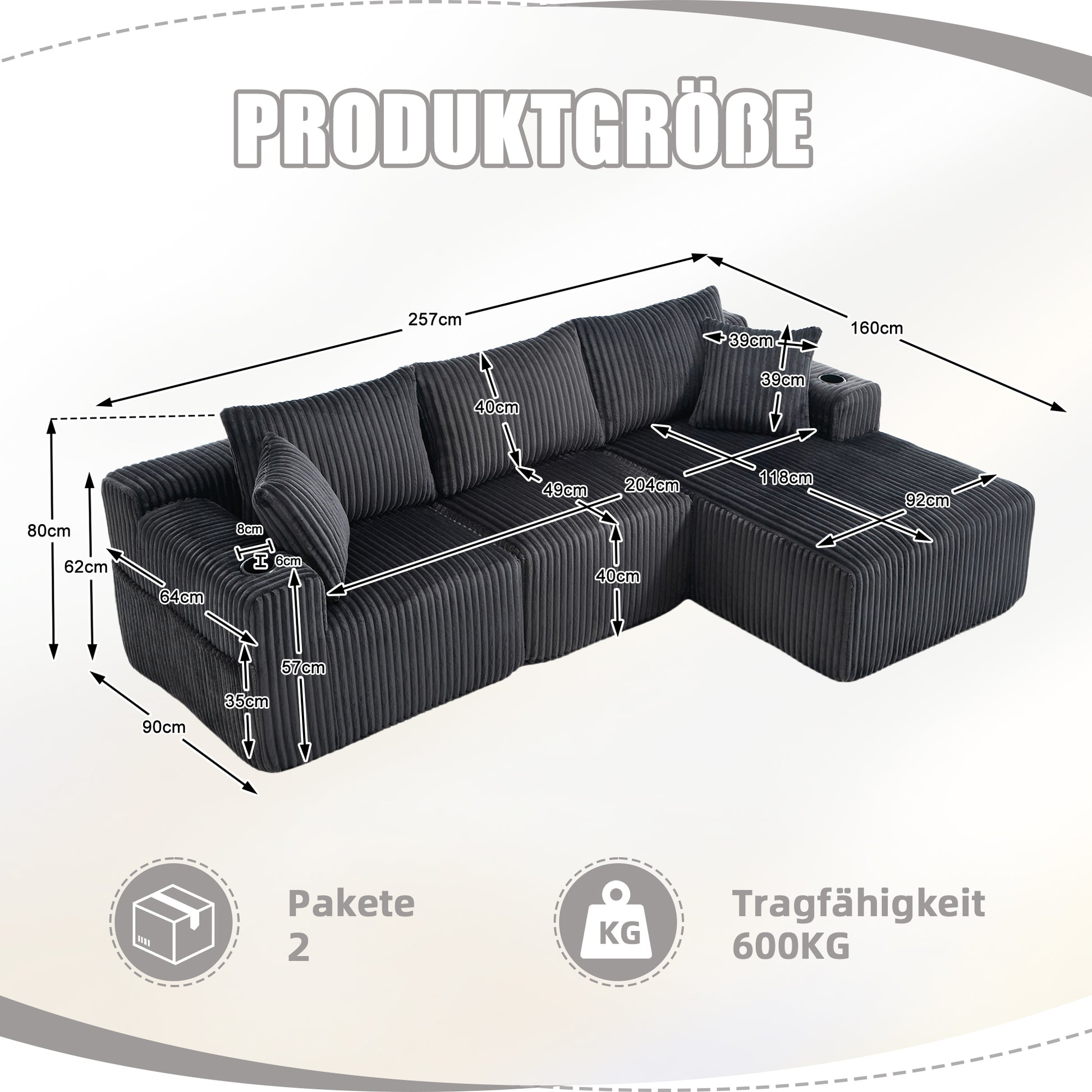 This sofa saves you the hassle of assembly. It arrives at your home fully upholstered – unpack, wait a moment, give it a light fluff, and you're done!