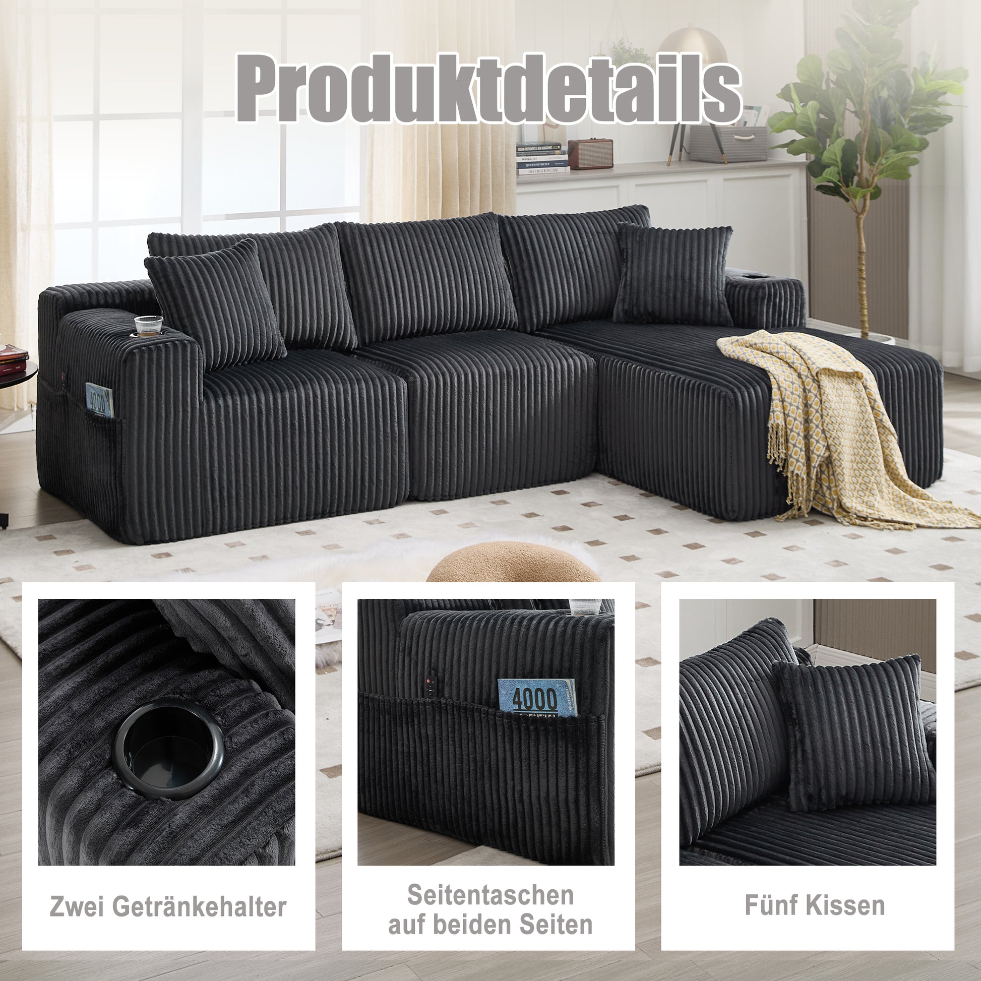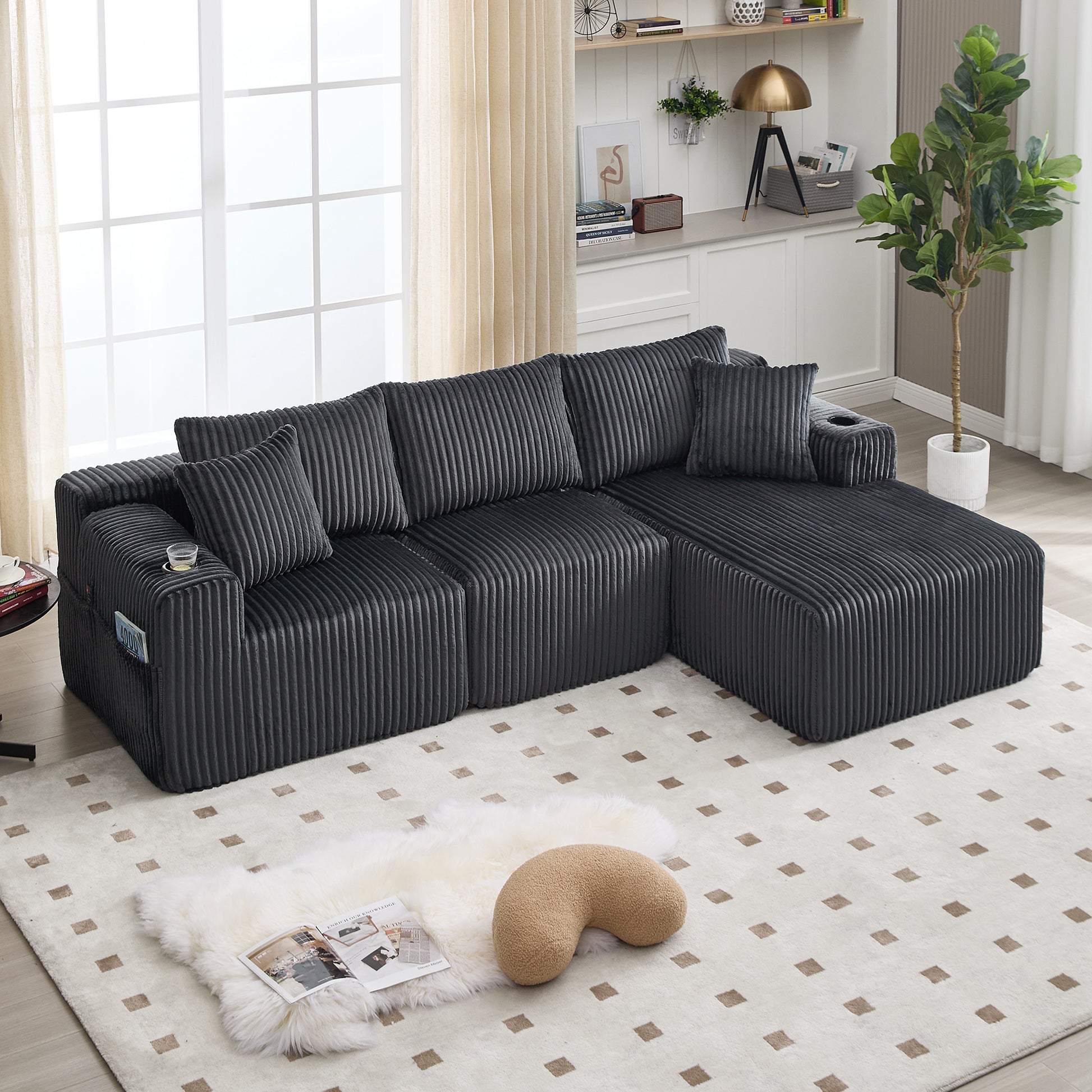 Modular Sofa Set Chaise 2-Seater Side Pockets Corduroy