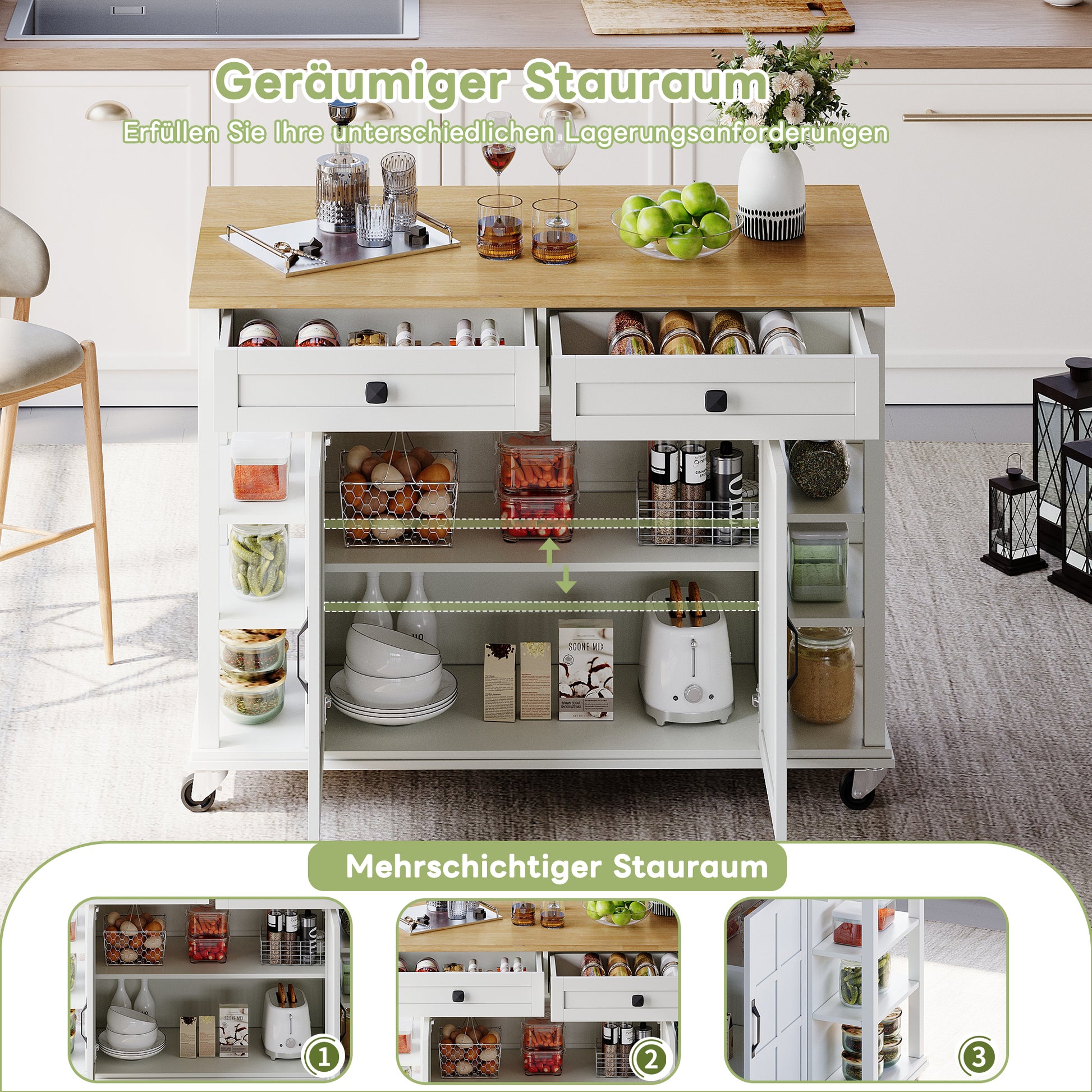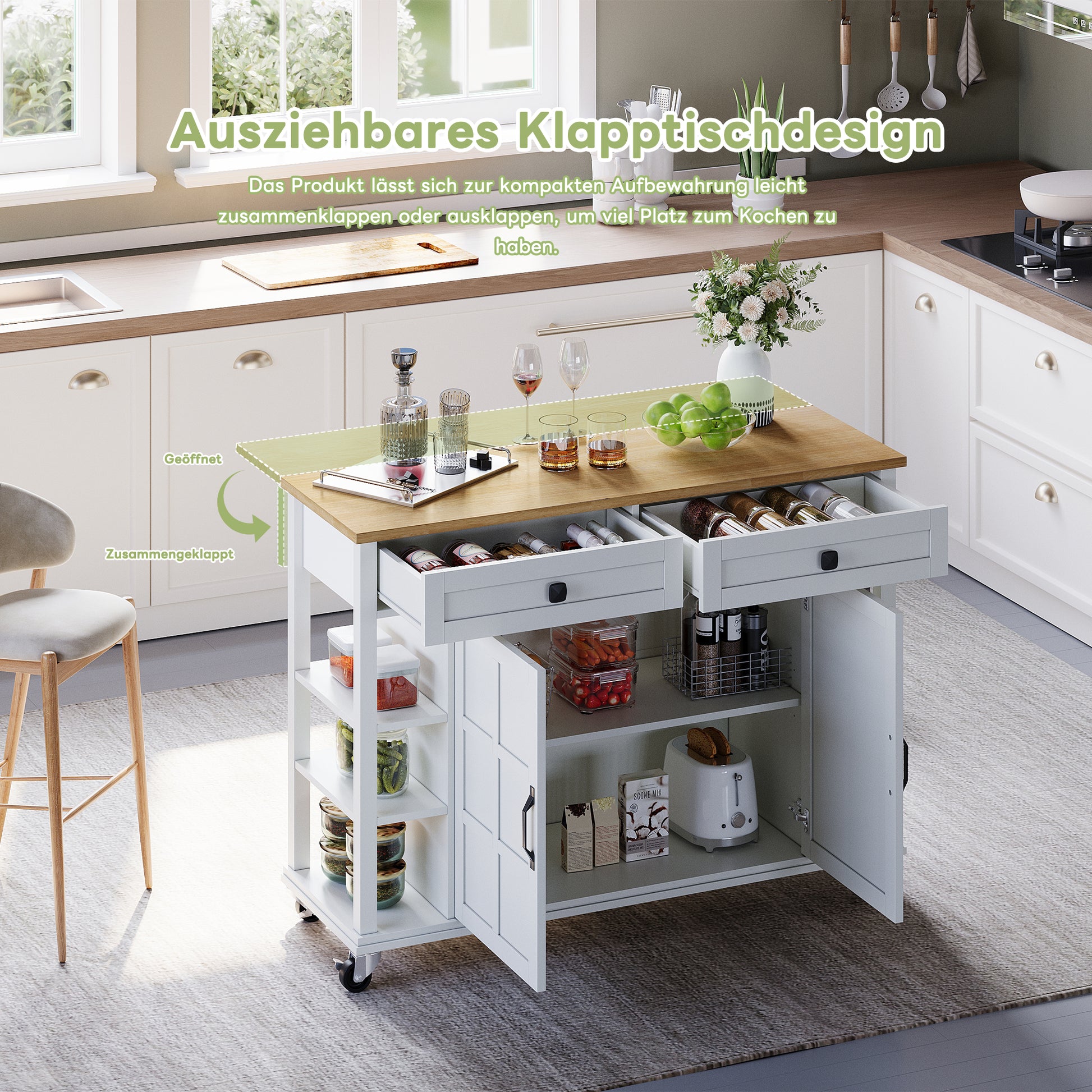 Multifunctional Kitchen Trolley, Fold-Down Worktop, 2 Drawers, On Wheels, Wood
