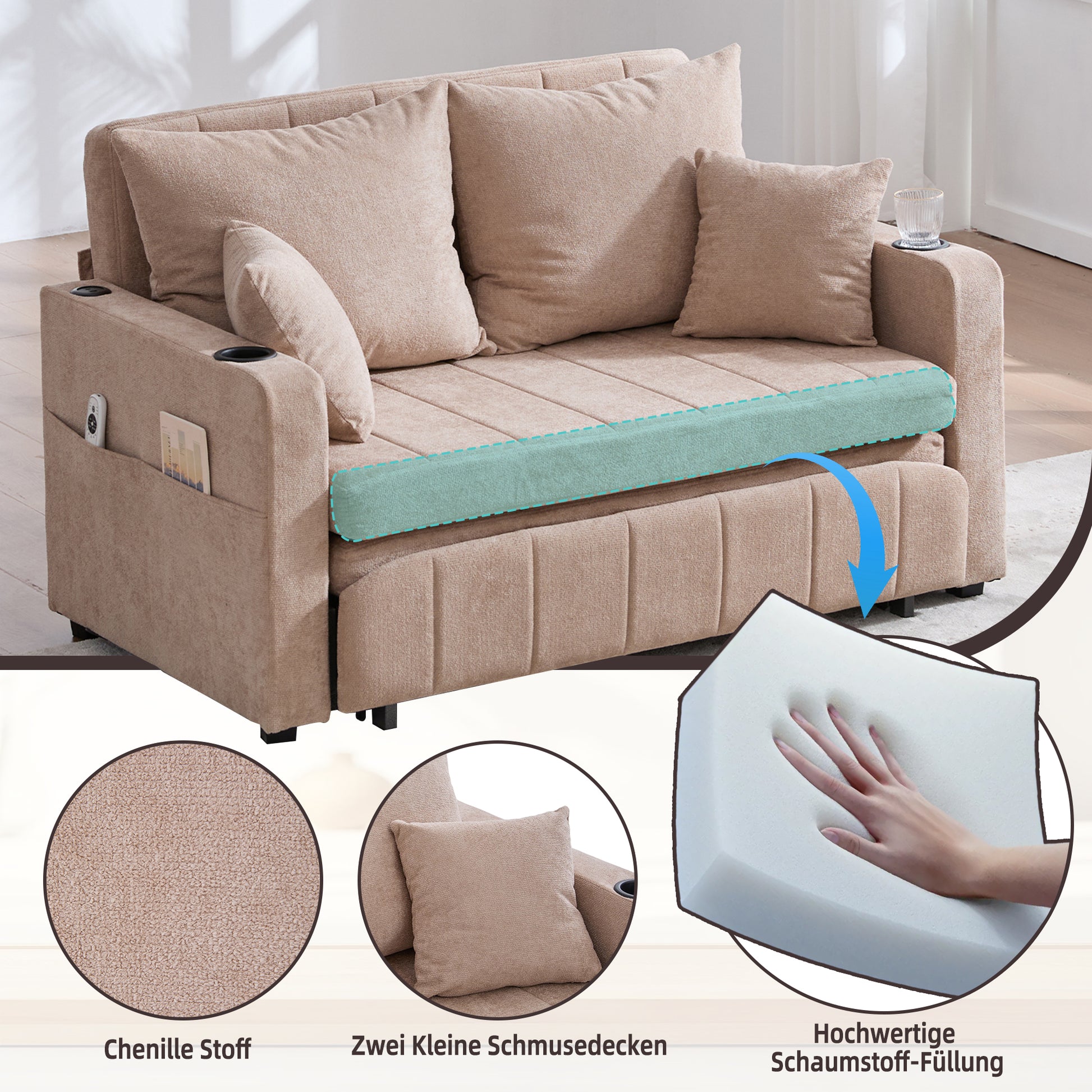 Multifunctional Sofa, Folding Pull-Out with Storage & USB, Fabric