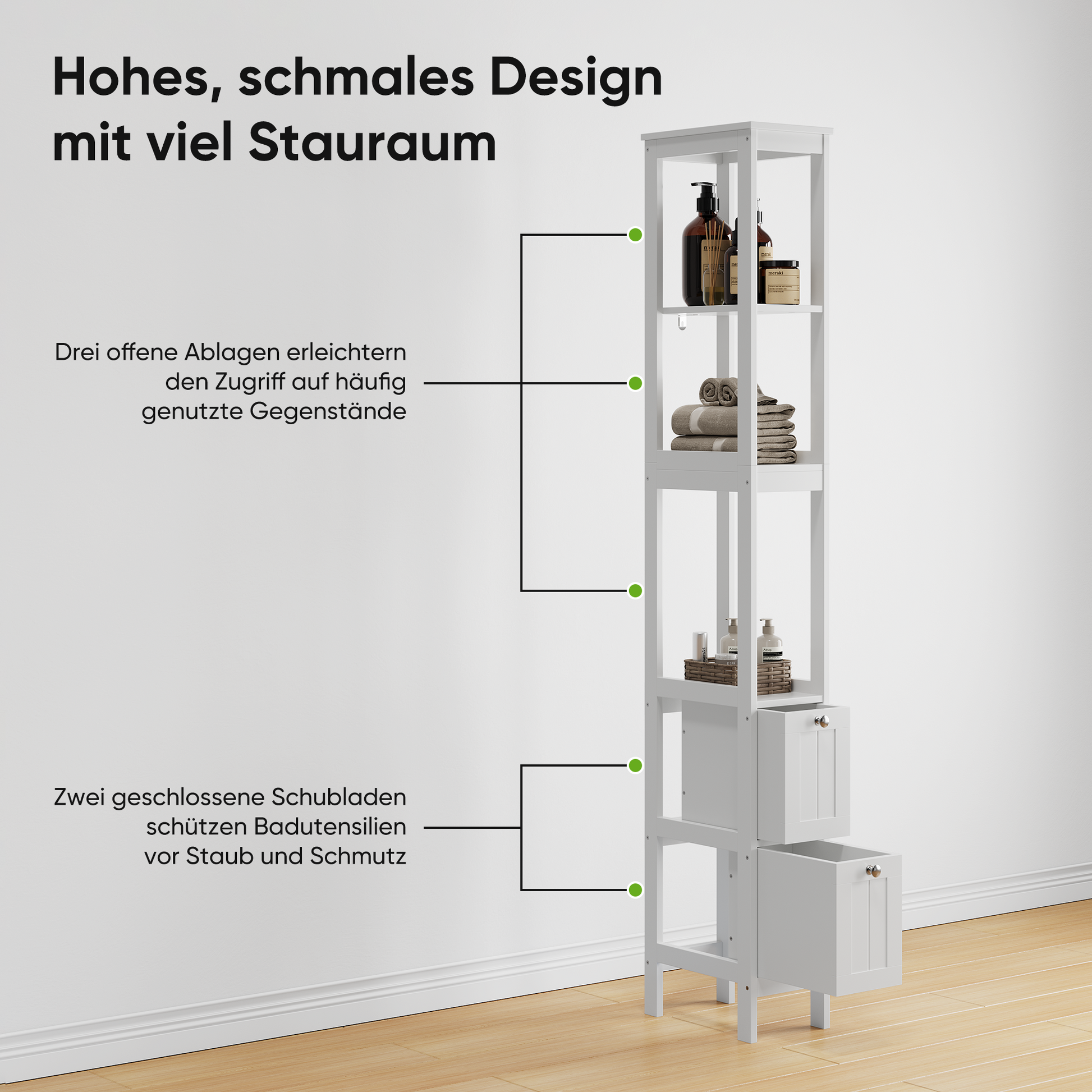 Crafted from high-quality MDF, this cabinet is easy to clean with a damp cloth. It offers both open shelves and hidden drawers, providing flexible storage options for daily essentials. Two spacious drawers glide out smoothly, perfect for organizing toilet paper, towels, cosmetics, and cleaning supplies. Three open shelves cater to a variety of storage needs.