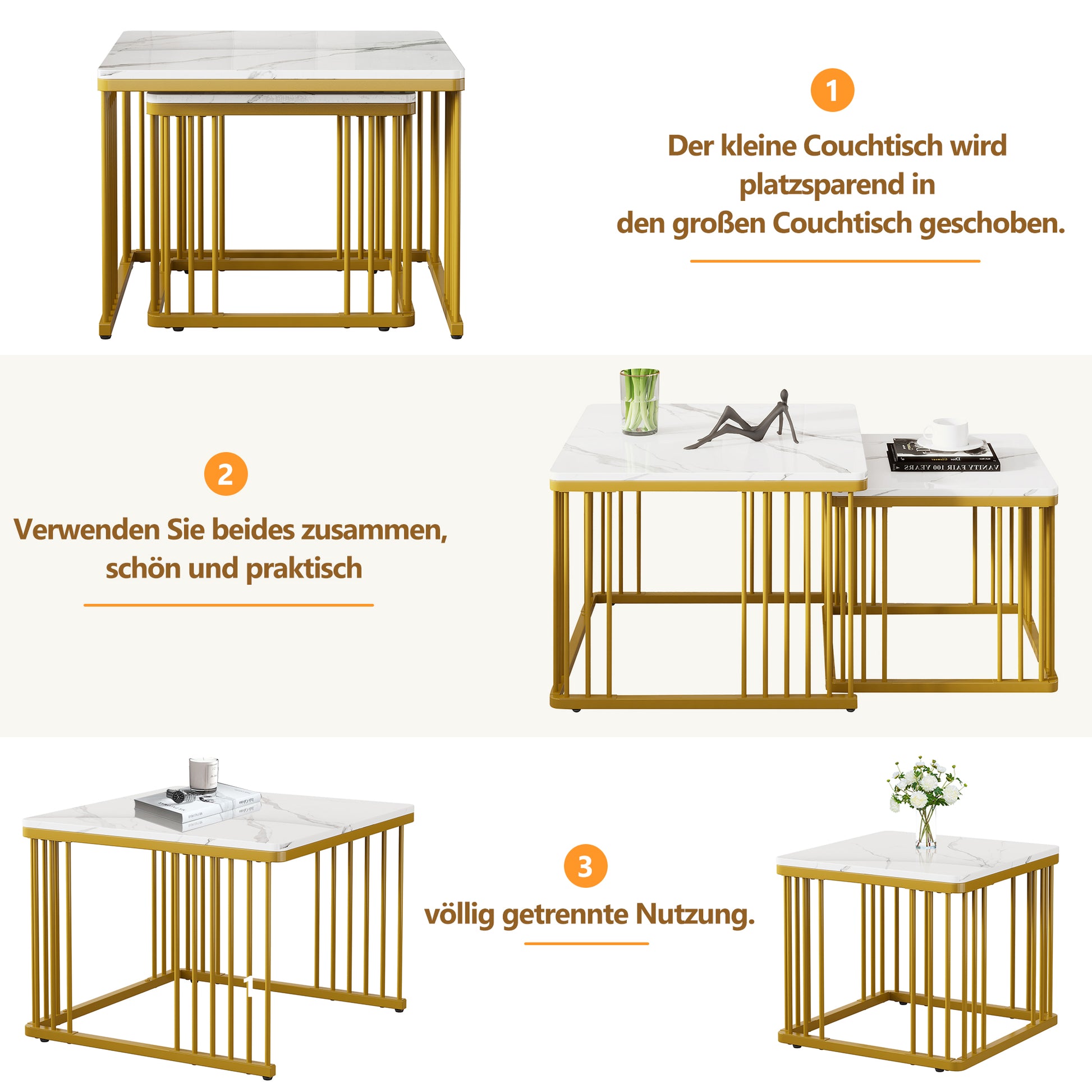 In summary, our set of two square, high-gloss, marble-effect coffee tables offers a stylish and functional solution for your living room. The combination of luxurious design, durable materials, and versatile uses makes this set an excellent choice for those who value both aesthetics and functionality. Enhance your home with these elegant and practical coffee tables and enjoy the perfect blend of style and utility.