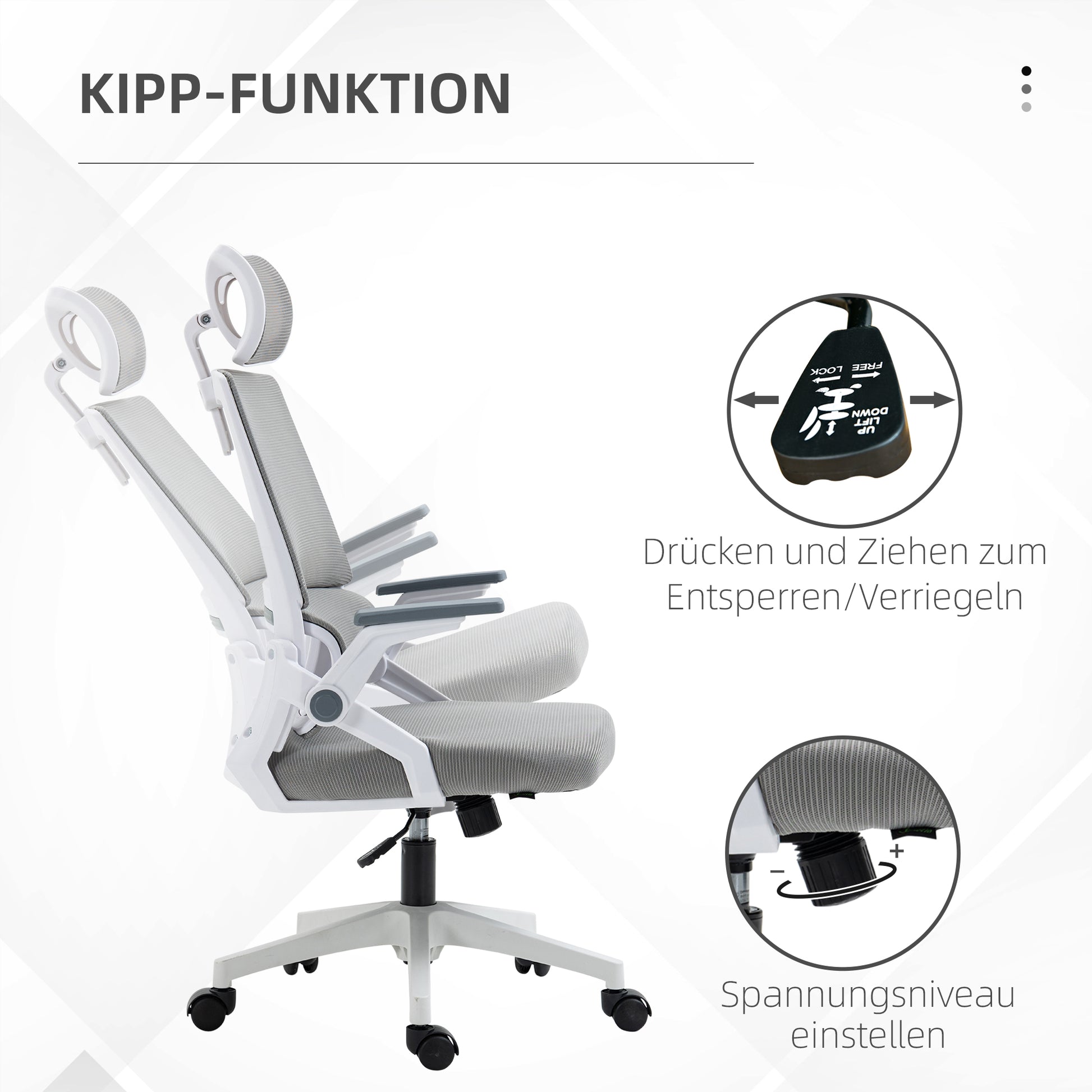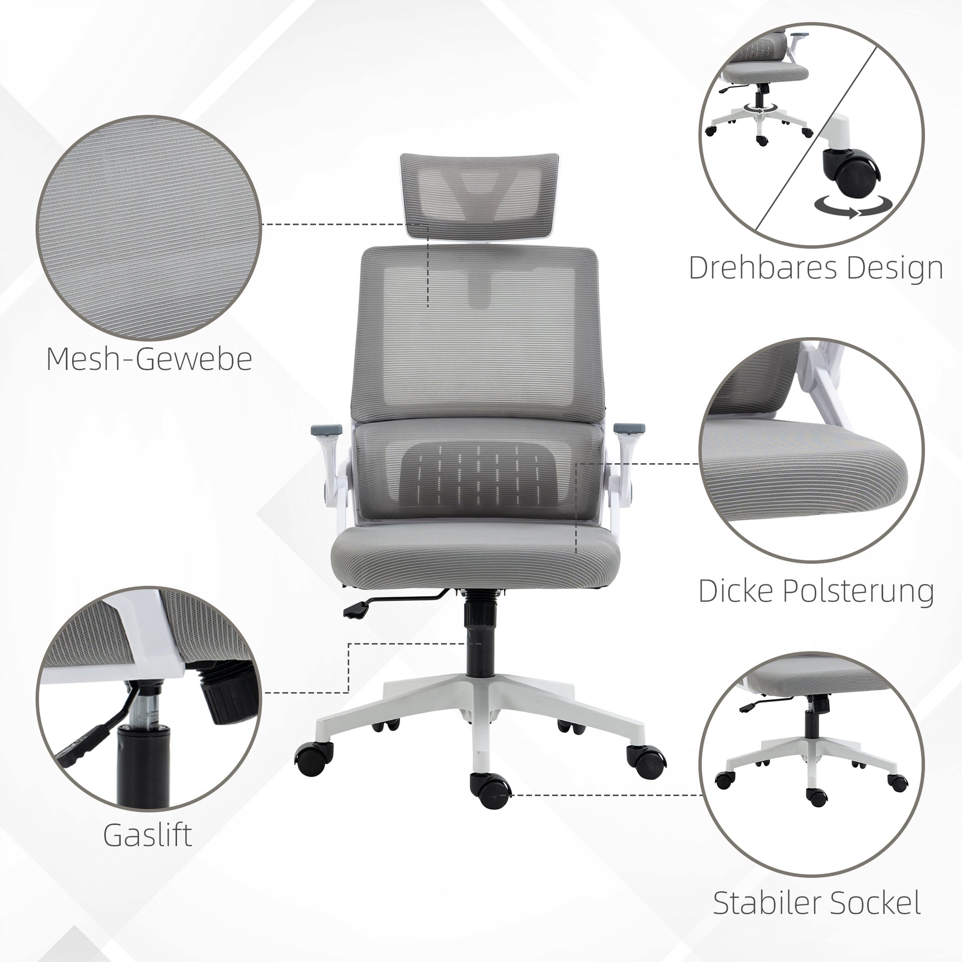 This comfortable gray PC chair is height-adjustable, allowing you to adapt it to your desk and sitting habits. The headrest can be moved up or down, rotated, and removed to help you relax your neck while sitting and prevent shoulder pain. The TÜV-certified gas lift provides added stability and prevents wobbling during use.
