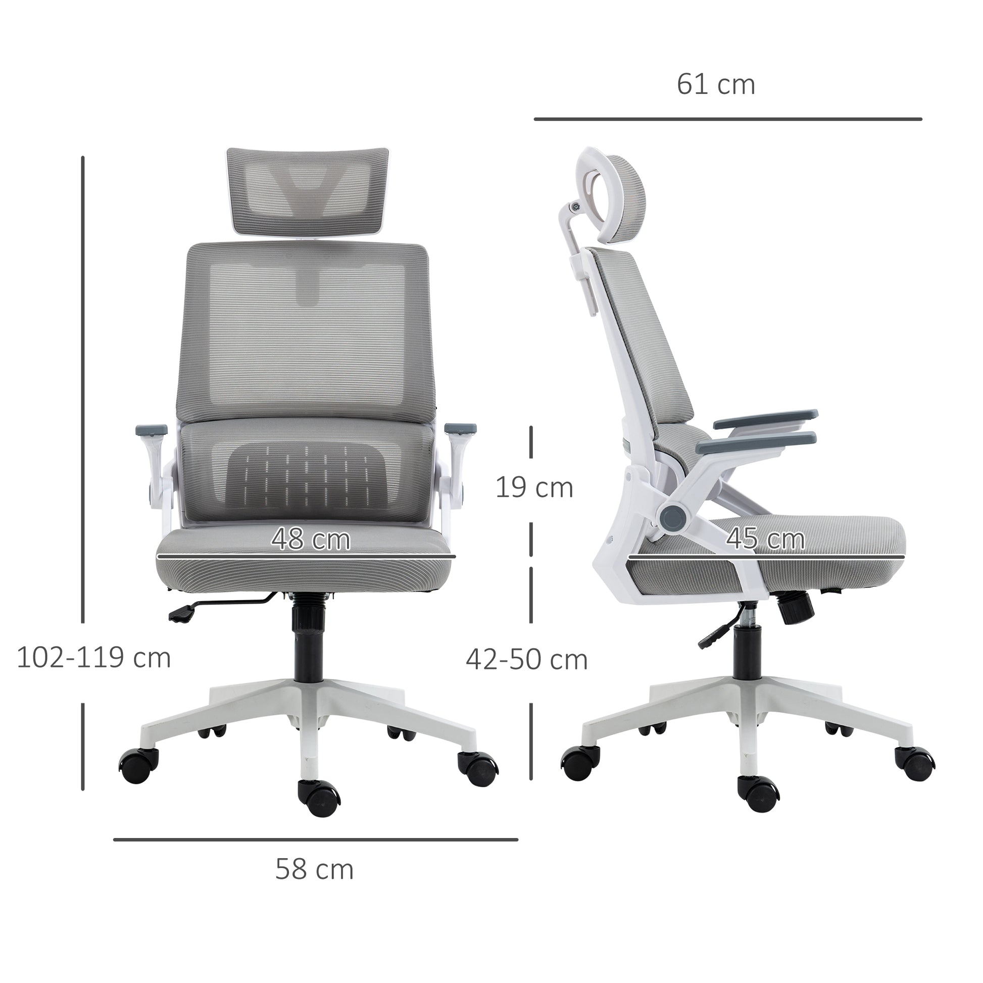 Overall dimensions of the office chair: 58L x 61W x 102-119H cm. Seat dimensions: 48L x 45W cm. Seat height: 42-50 cm. Weight capacity: 120kg. Assembly required.