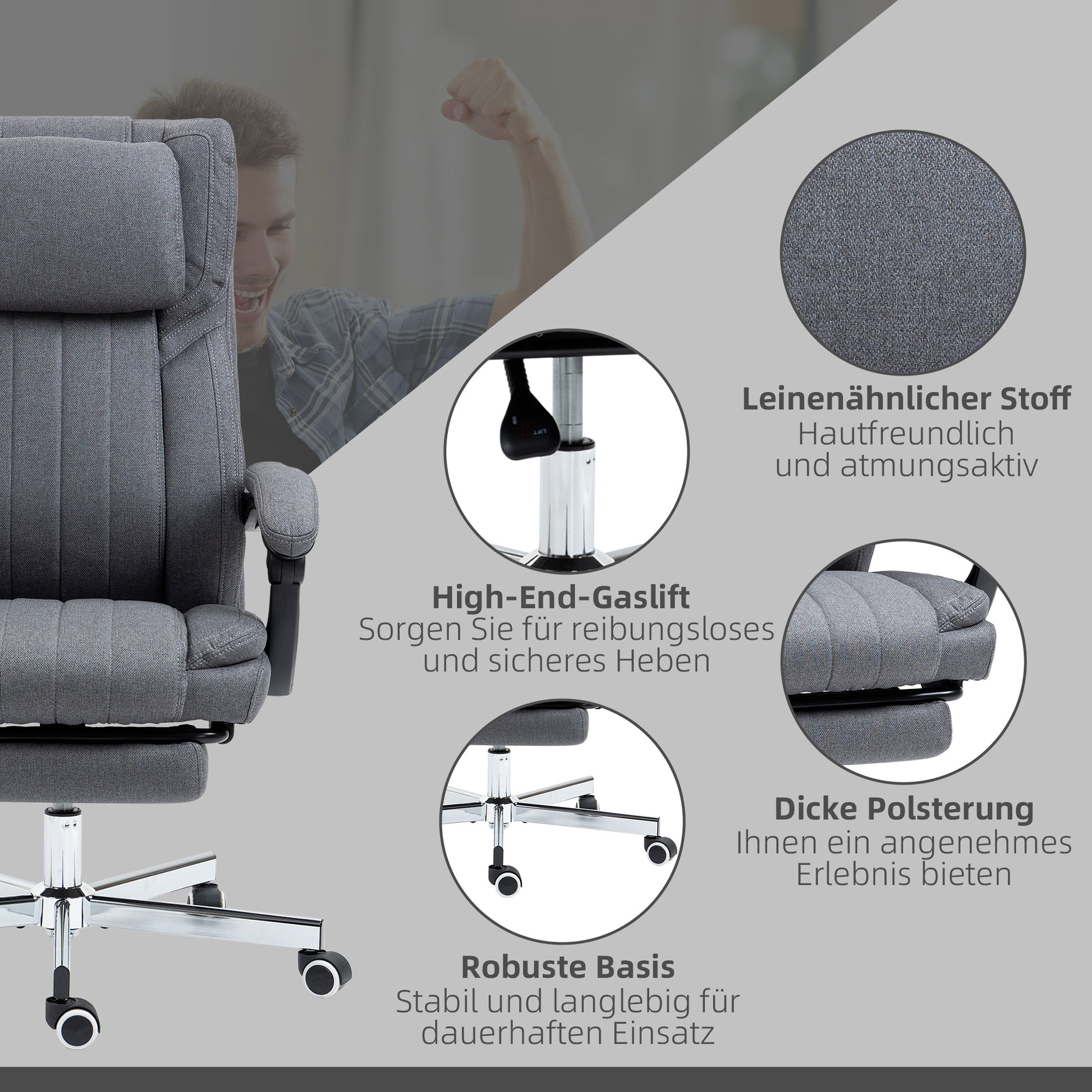 Office Chair Massage Modes Reclining Height Adjustable Footrest, Grey Linen Look