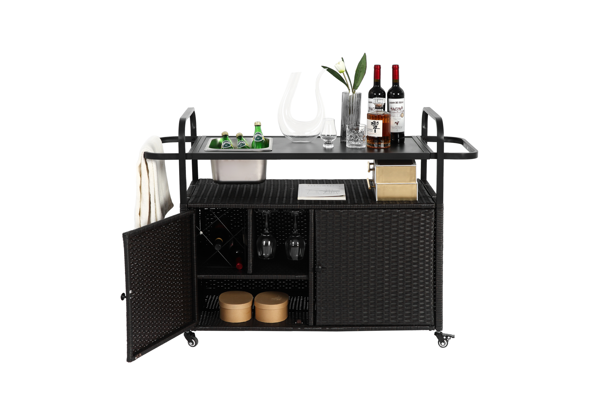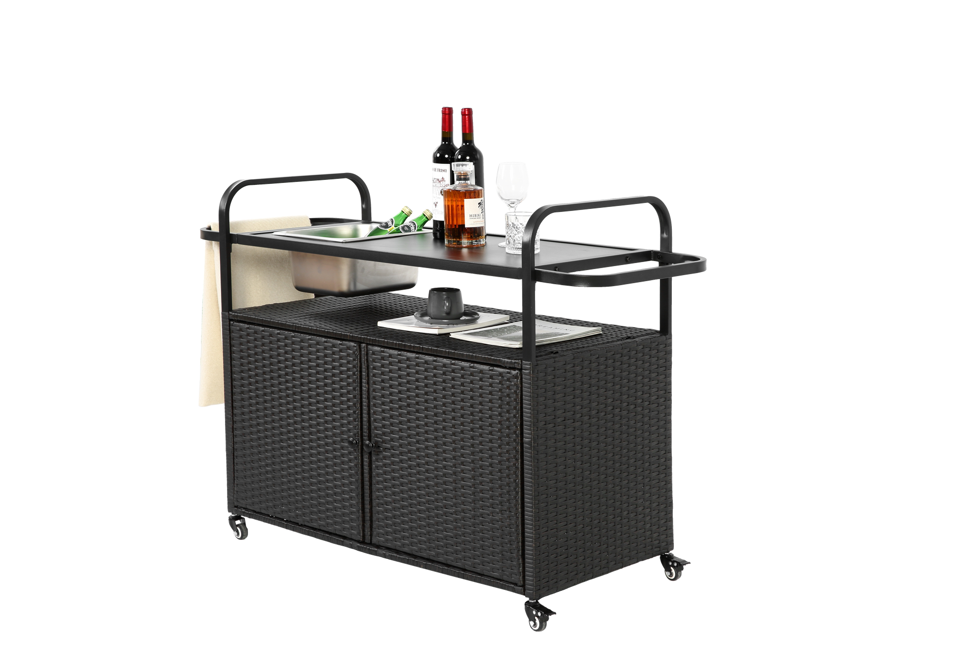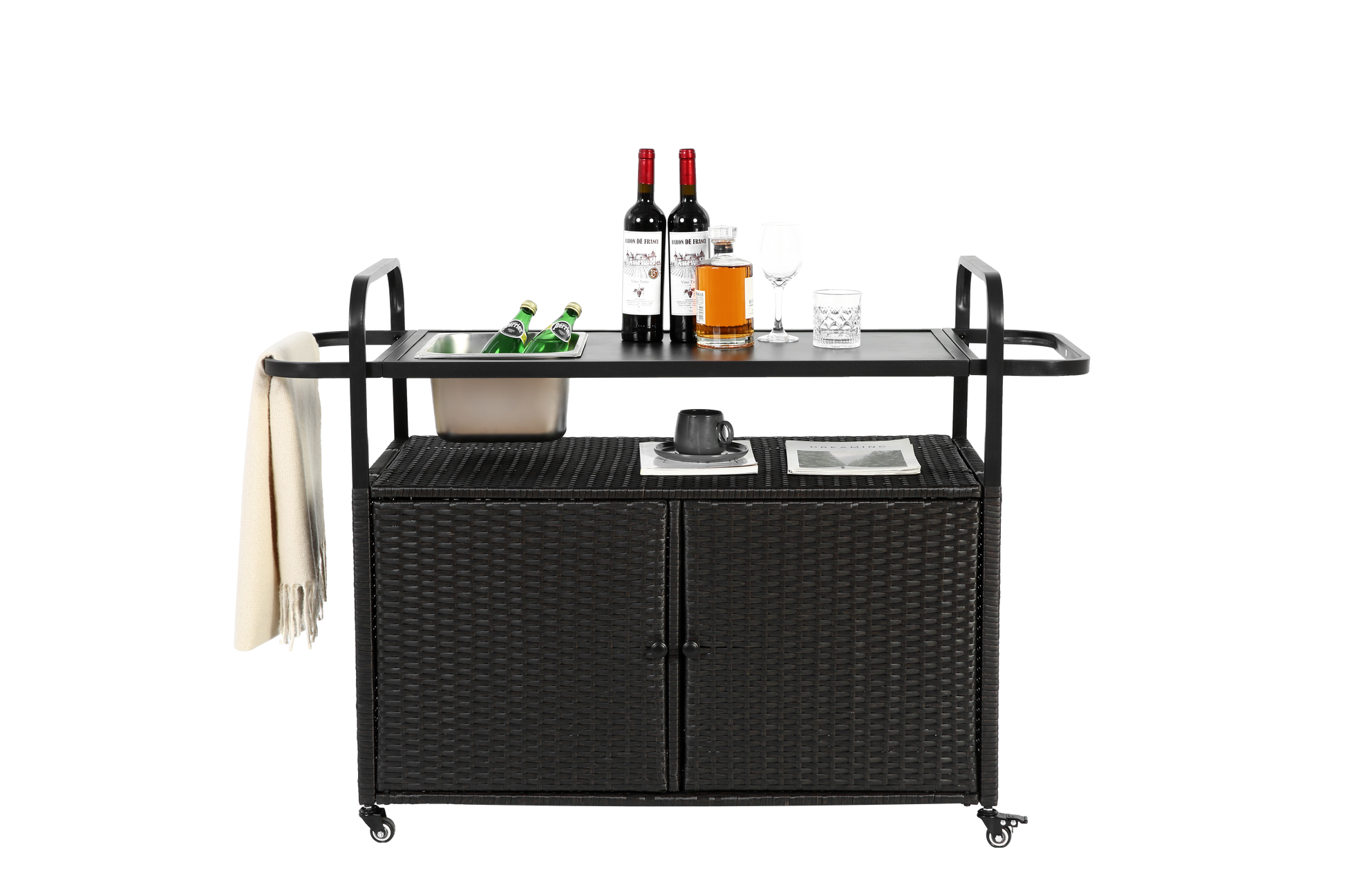 Outdoor Bar Table, Wicker Bar Cart with Cabinet-Balck