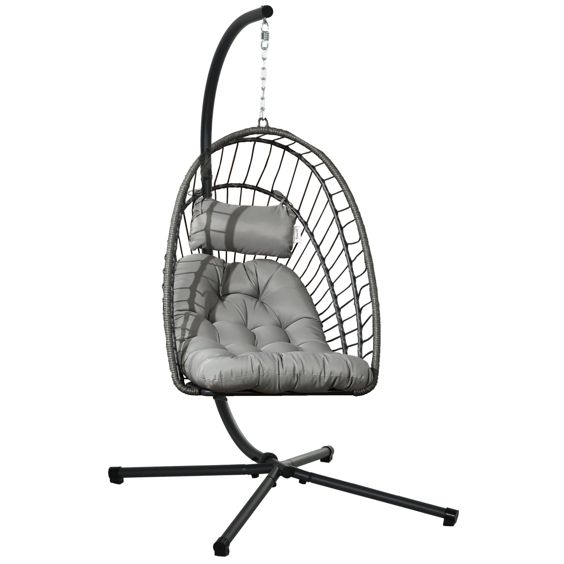 Outdoor PE Rattan Swing Chair Foldable Hanging Egg Chair with Metal Stand and Cushion, Light Grey
