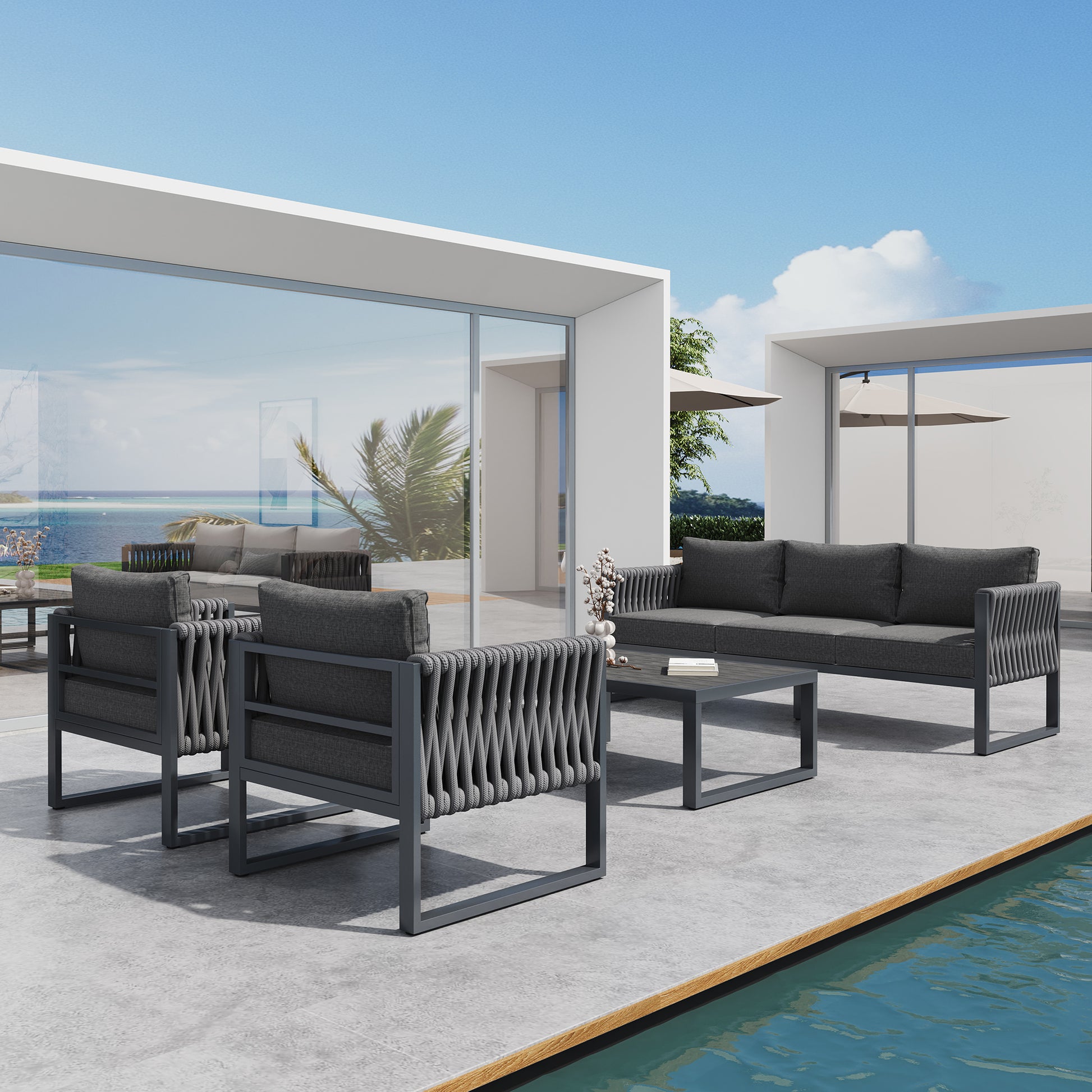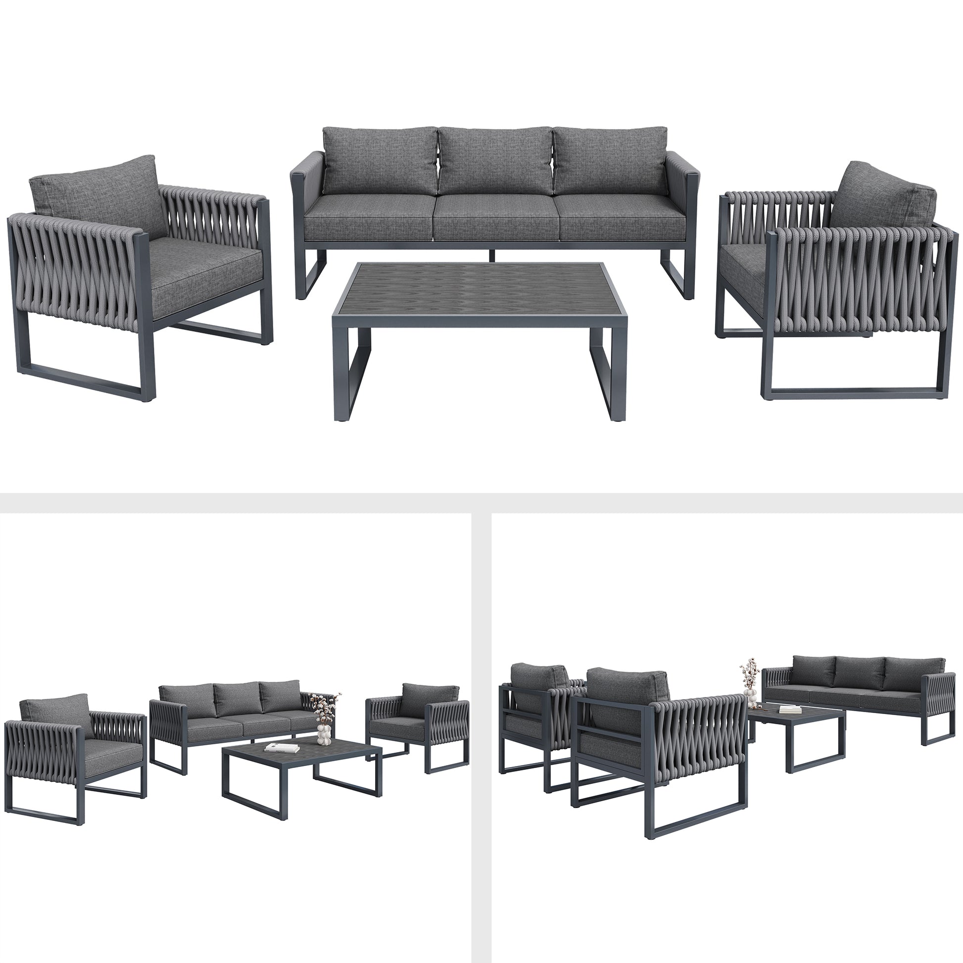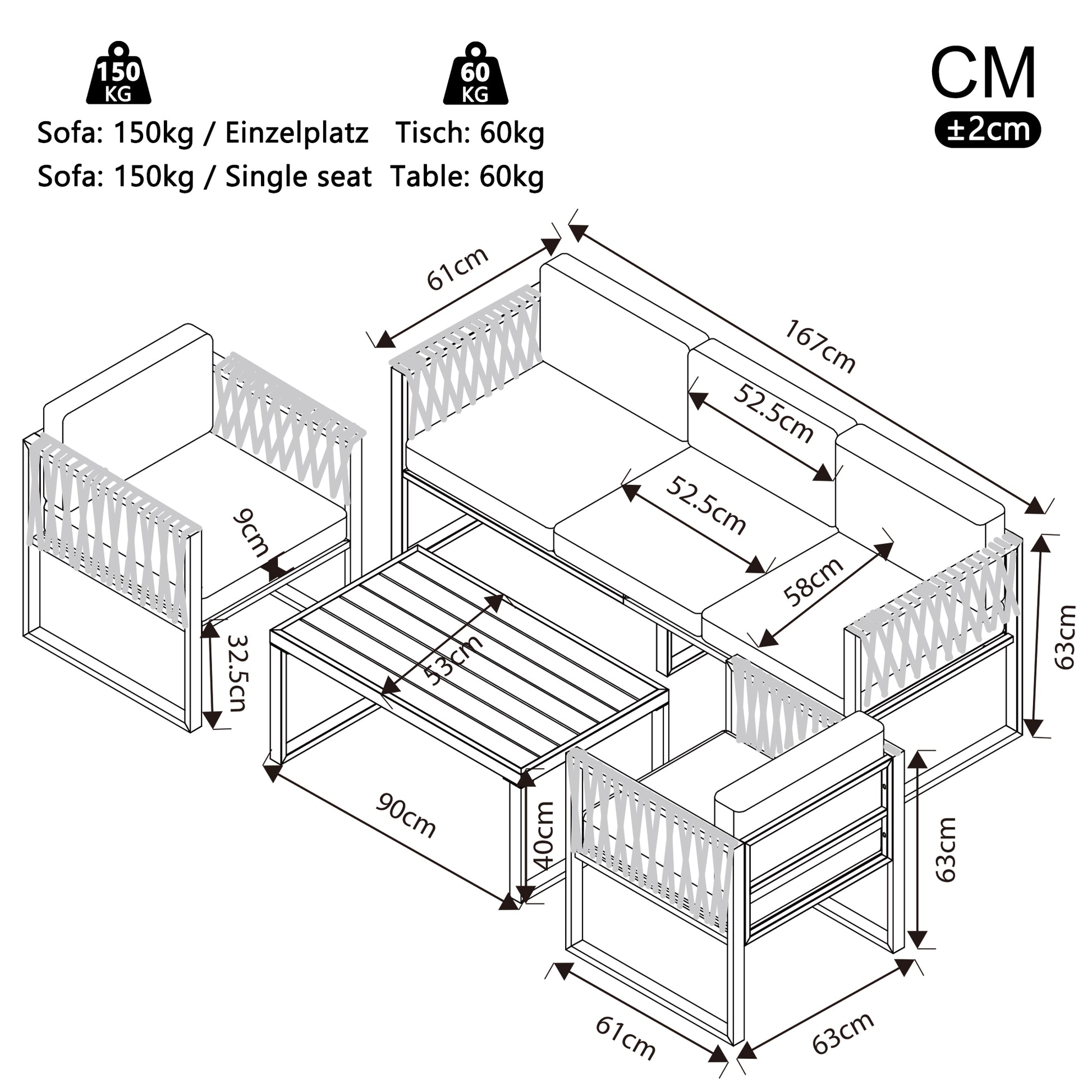 This outdoor sofa set is specially designed for year-round use. The frame is made of high-quality galvanized iron tubing, which is rust and corrosion resistant, combined with a stable metal base and adjustable feet for secure footing on any surface. The thickened, weatherproof ropes are not only pleasant to the touch but are also exceptionally colorfast and dimensionally stable, offering a significantly longer lifespan compared to conventional ropes. Whether on the balcony, patio, or in the garden, this set withstands intense sunlight and rain, maintaining its shape and aesthetic appeal.