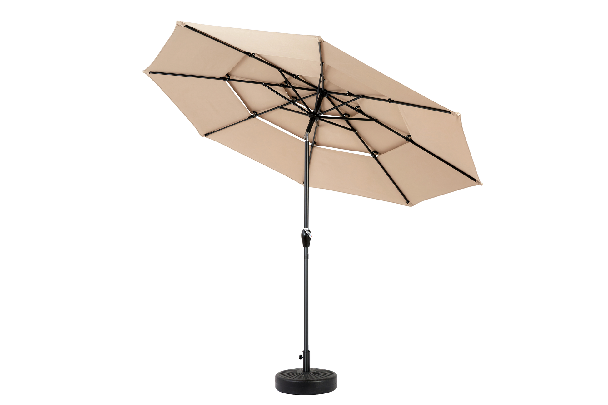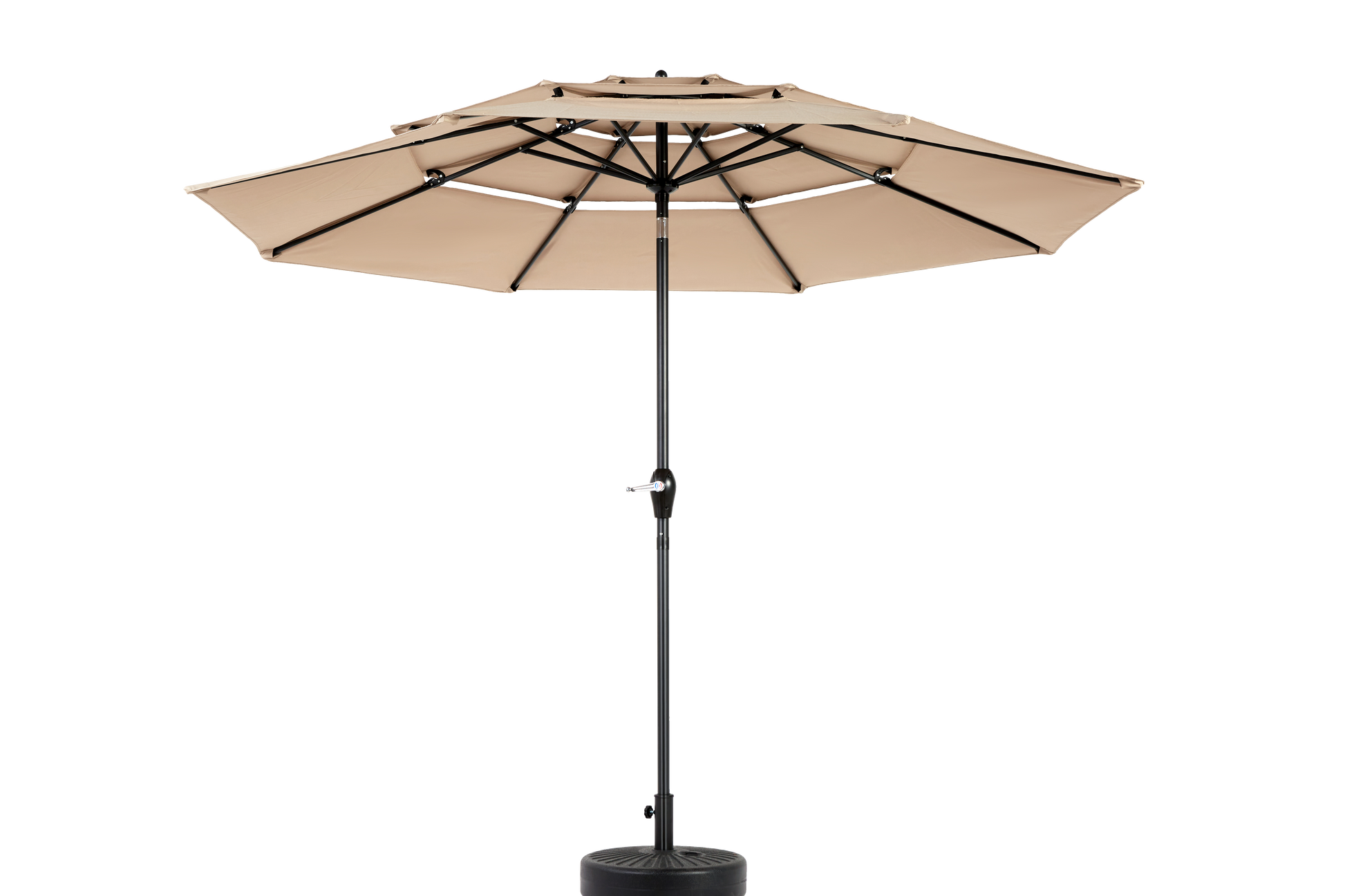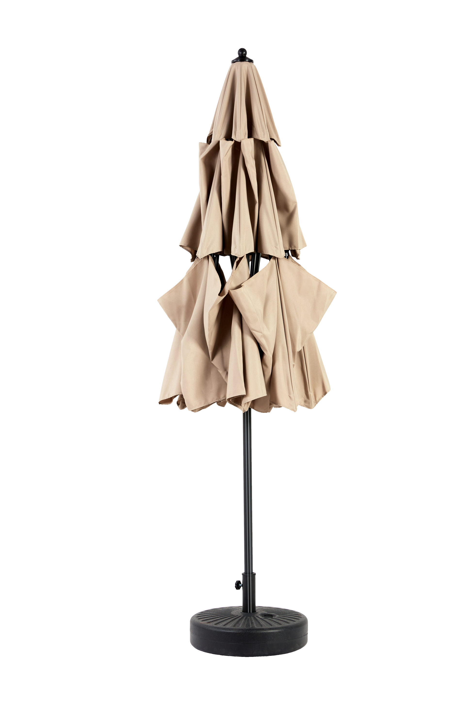 With its simple crank mechanism, this market umbrella can be opened and closed in just a few seconds by rotating the handle. This lightweight umbrella does not include a base.