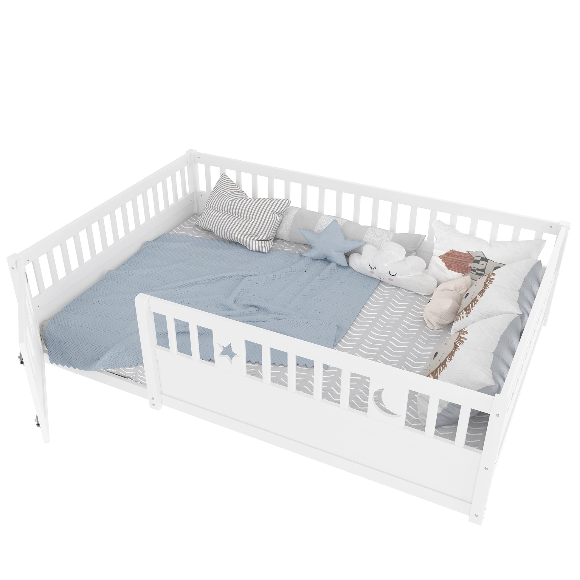 Panel Bed, 140x190cm Children's Bed with Railing & Star/Moon Decoration, White
