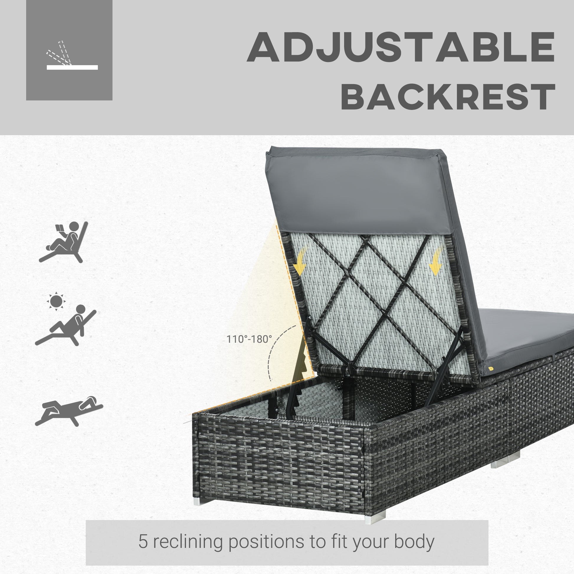 PE Rattan Sun Lounger, Five-level Adjustable Recliner with Padded Cushion, Mixed Grey