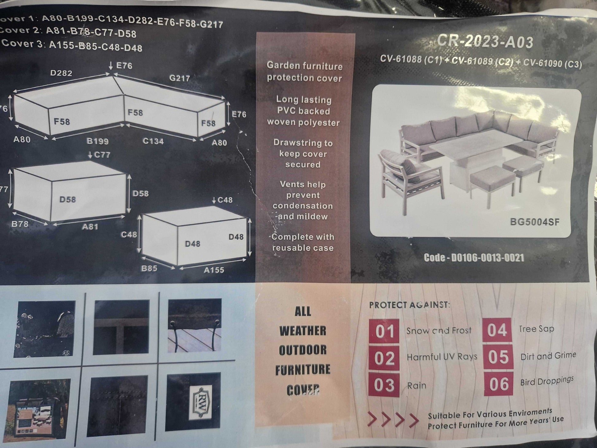 This unit is designed to fit over a corner sofa set with a rectangular rising table, one single sofa, and two footstools. It comes as a three-part cover set for complete and tailored protection.