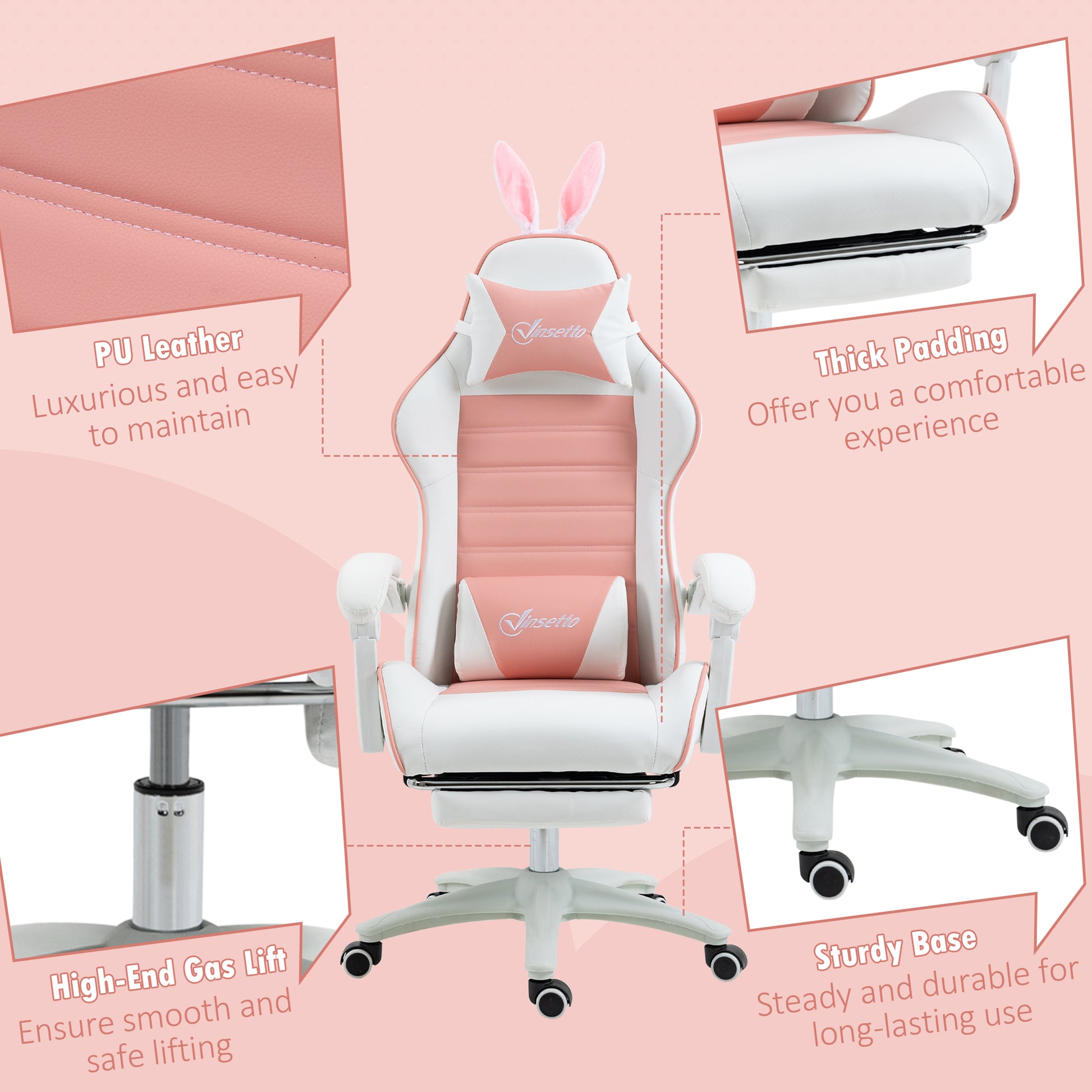 Racing Gaming Chair Reclining with Rabbit Ears Footrest Pink PU Leather