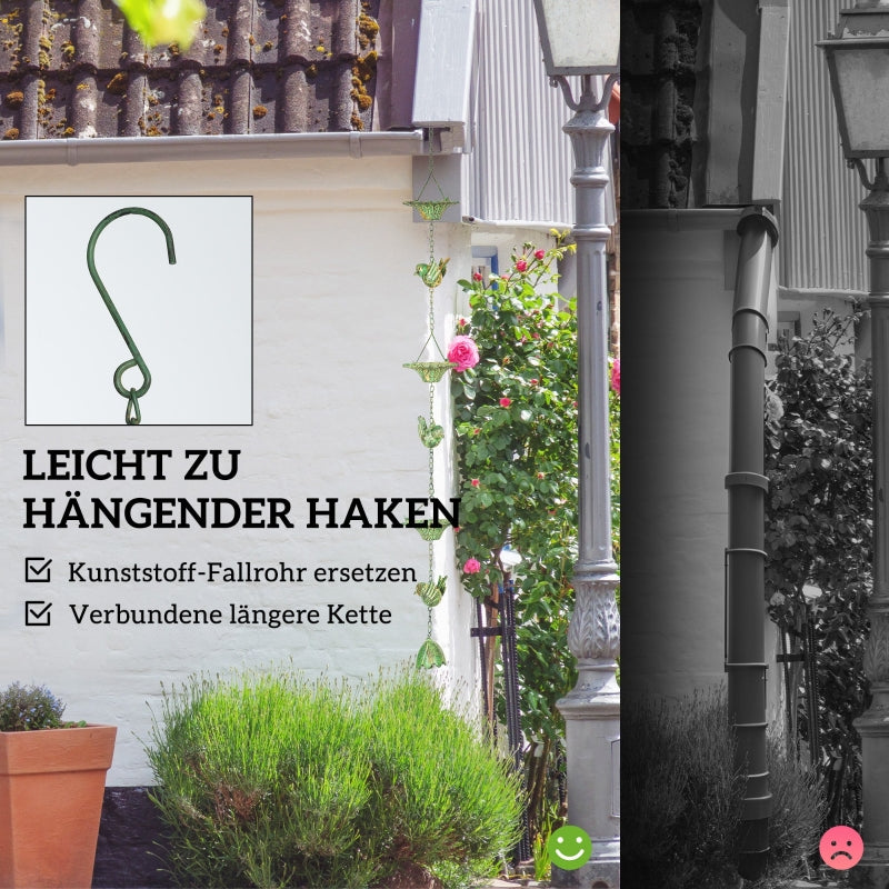 Easy Installation: Install the rain chains quickly and easily with the included hooks as an alternative to conventional rain gutters. They effectively redirect rainwater and add a charming touch to your gutters.