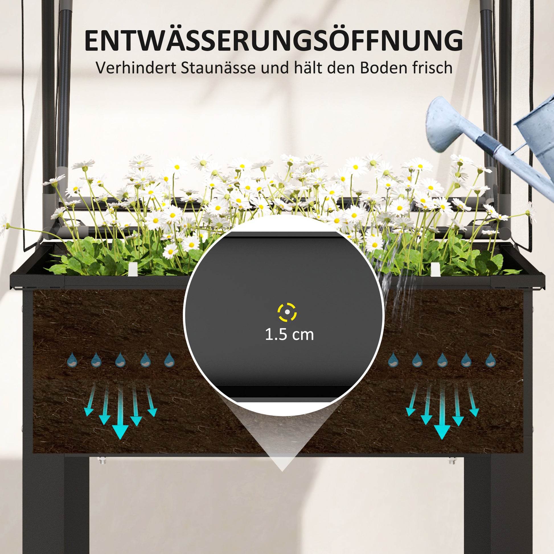 This raised bed effectively protects plants from weeds and pests, minimizes bending, and increases comfort for people with mobility issues. It is equipped with a drainage hole to prevent waterlogging, which helps keep the soil fresh and promotes healthy plant growth.