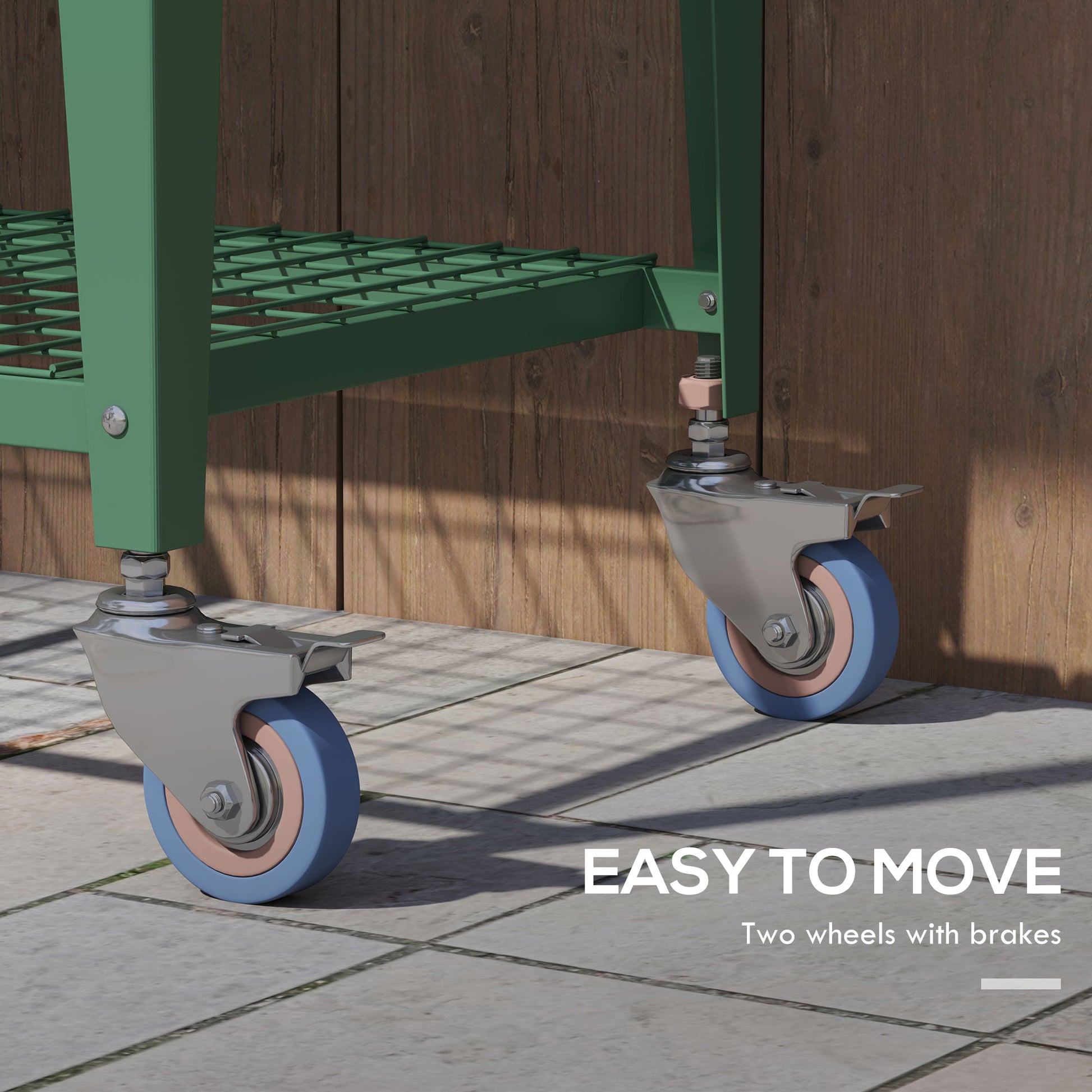 The metal frame includes a bottom shelf and wheels, offering a strong and supportive structure. The bottom shelf provides handy storage for items you want close. The wheels allow for easy movement and include brakes to lock the planter into place.