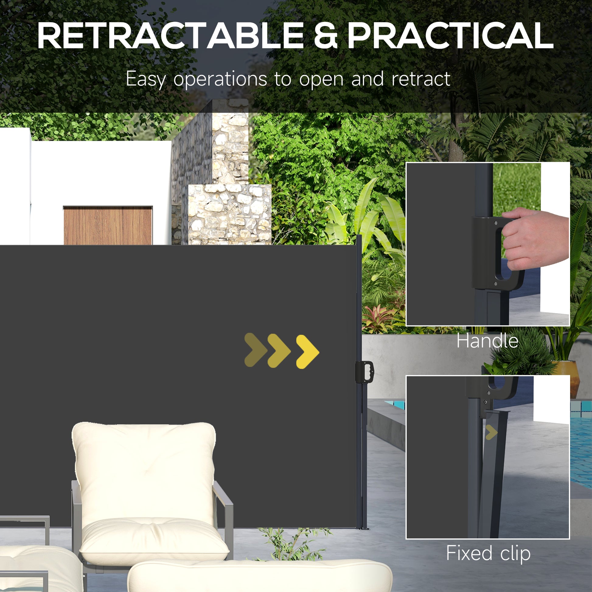 The retractable screen is made from UV30+ PU coated 180gsm polyester, which keeps you protected and provides shade without fading. The retractable design makes the patio windbreak flexible and easy to open and retract into position.
