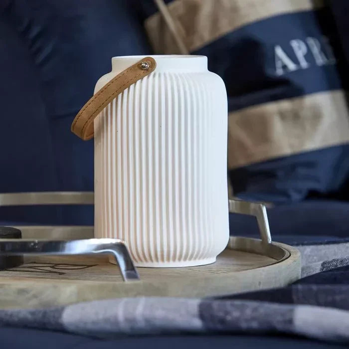 The RM Arbois Lantern exudes sophistication with its rib-textured design and a lavish leather handle. Crafted from white porcelain, it is designed to accommodate a tea light, making it a charming addition to your ambiance. This small lantern is a true mood enhancer, and its contemporary design seamlessly complements any decor.