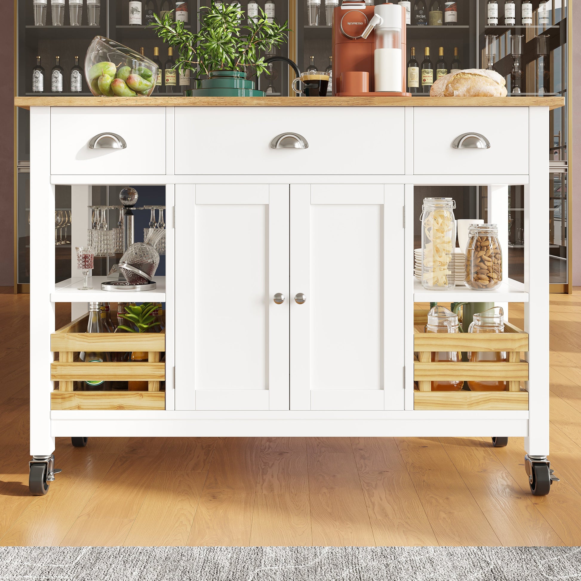 Rolling Kitchen Island Storage Trolley with Large Cabinet, 3 Drawers, Spice Rack & Adjustable Shelf, White