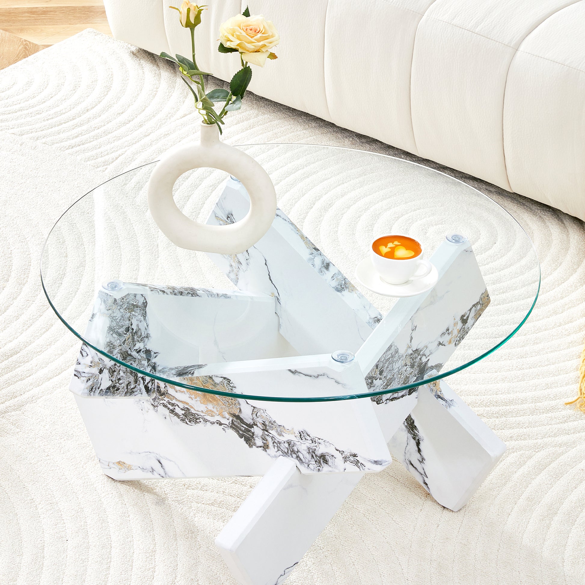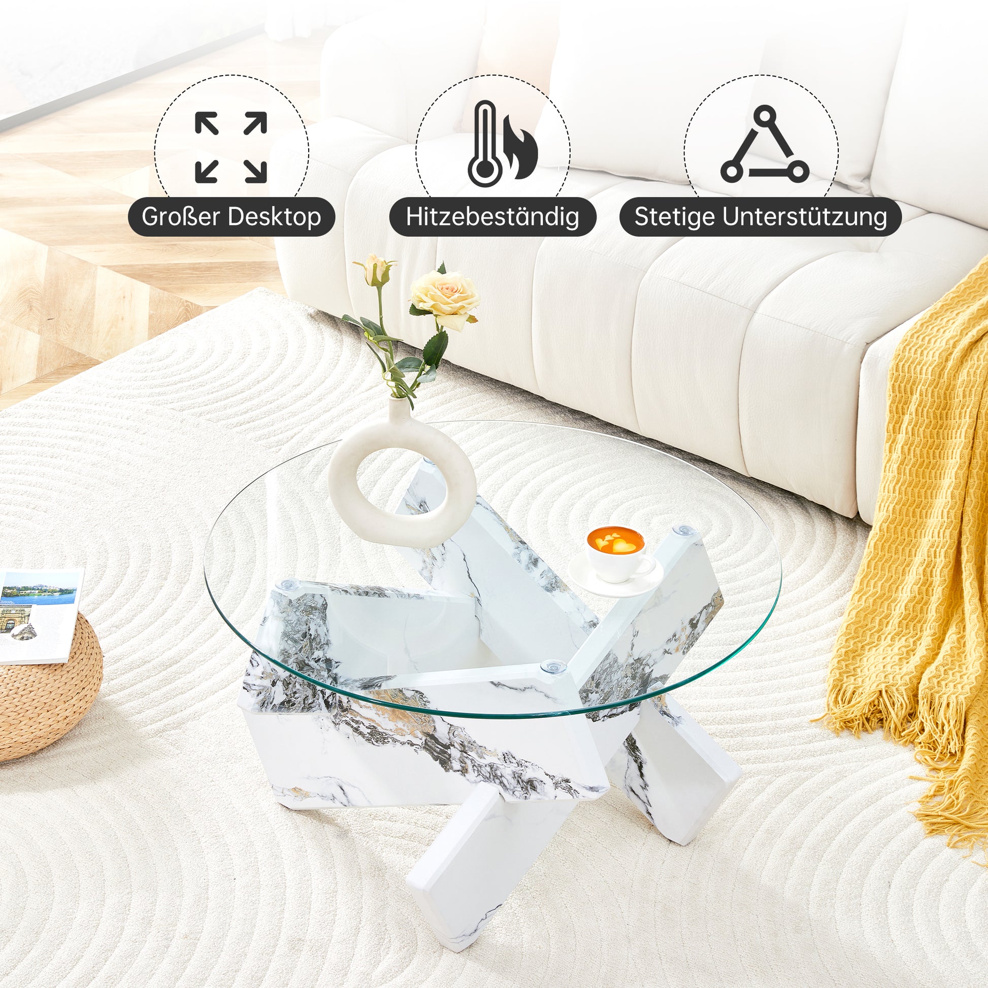 Round Coffee Table Glass Top 79cm Marble Look Legs - Multi-color