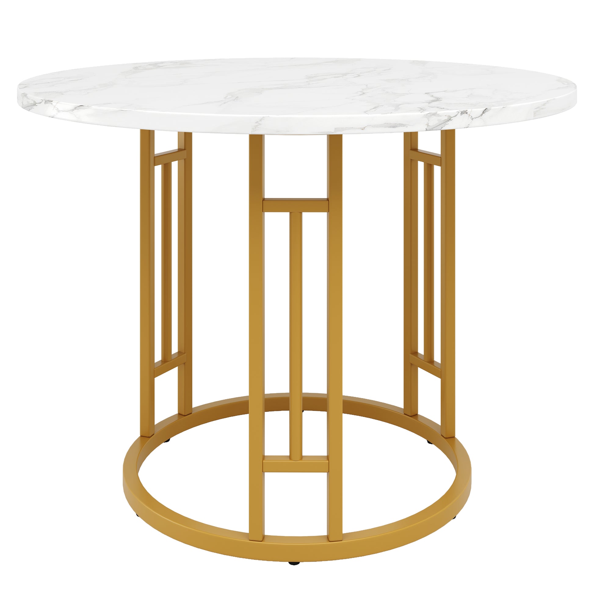The thickened MDF tabletop features a realistic marble texture, creating an exquisite table pattern. The combination of delicate texture and elegant color not only ensures durability but also creates a high-quality visual effect, effortlessly enhancing the dining atmosphere. The slim metal frame is unique, boasting elegant and charming lines that define a classic style. The geometric structural design not only provides stable support for the round table but also highlights the beauty of modern art. The metallic sheen and the material of the tabletop complement each other, adding a unique charm to any living space.