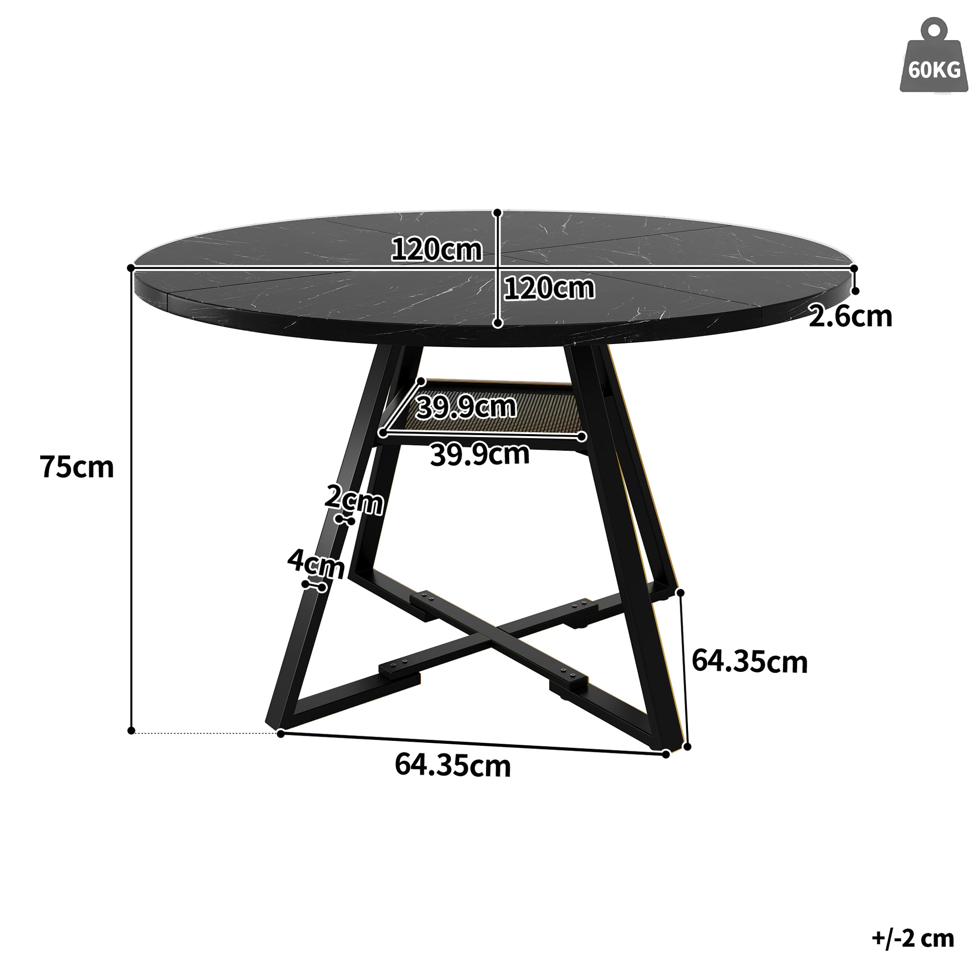 Tabletop diameter: 120 cm, table height: 75 cm, load capacity: 60 kg.