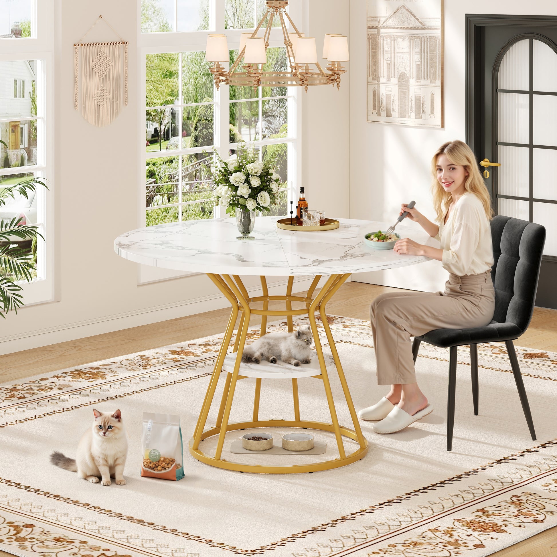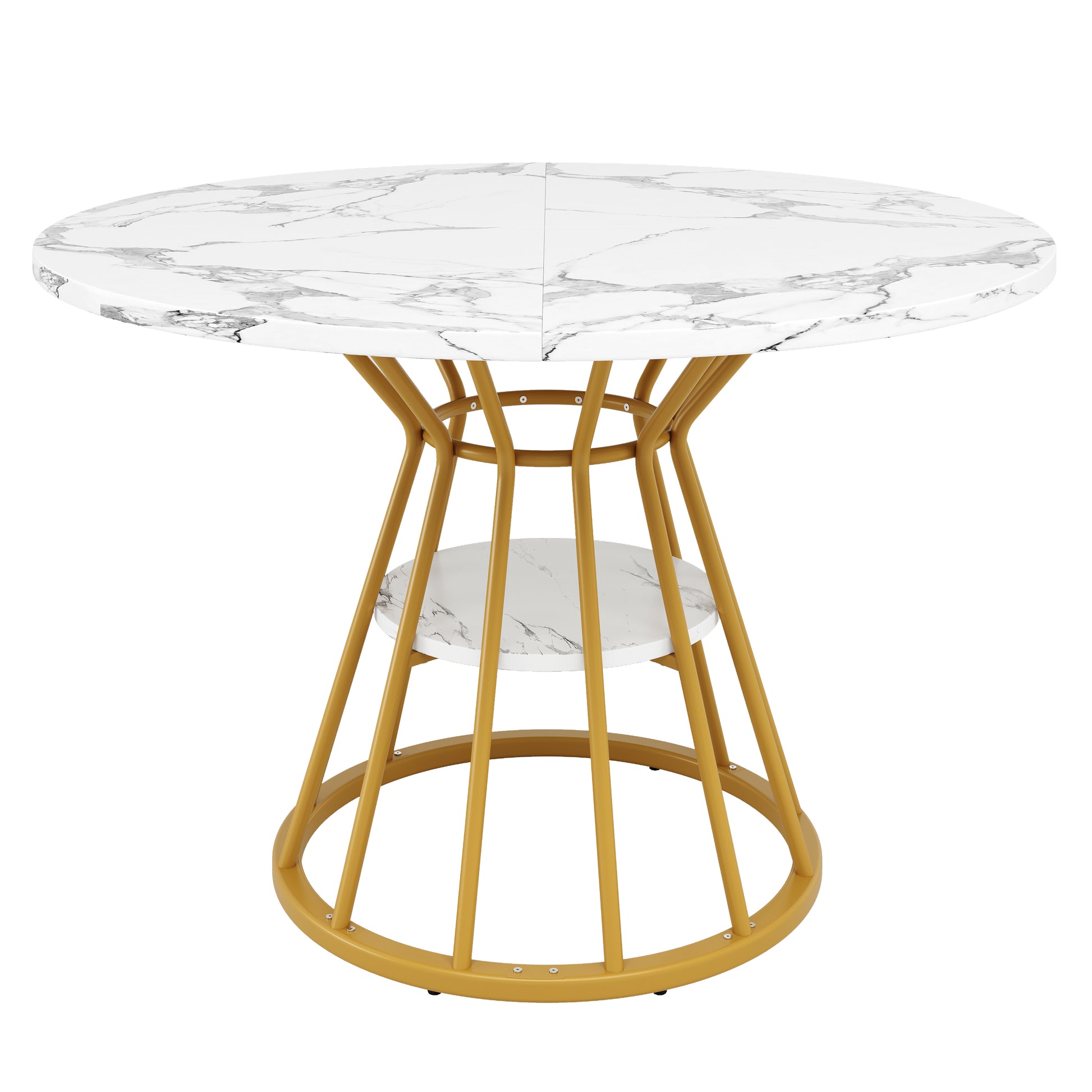 Round Dining Table, Metal Legs Marble Pattern, Gold/Black
