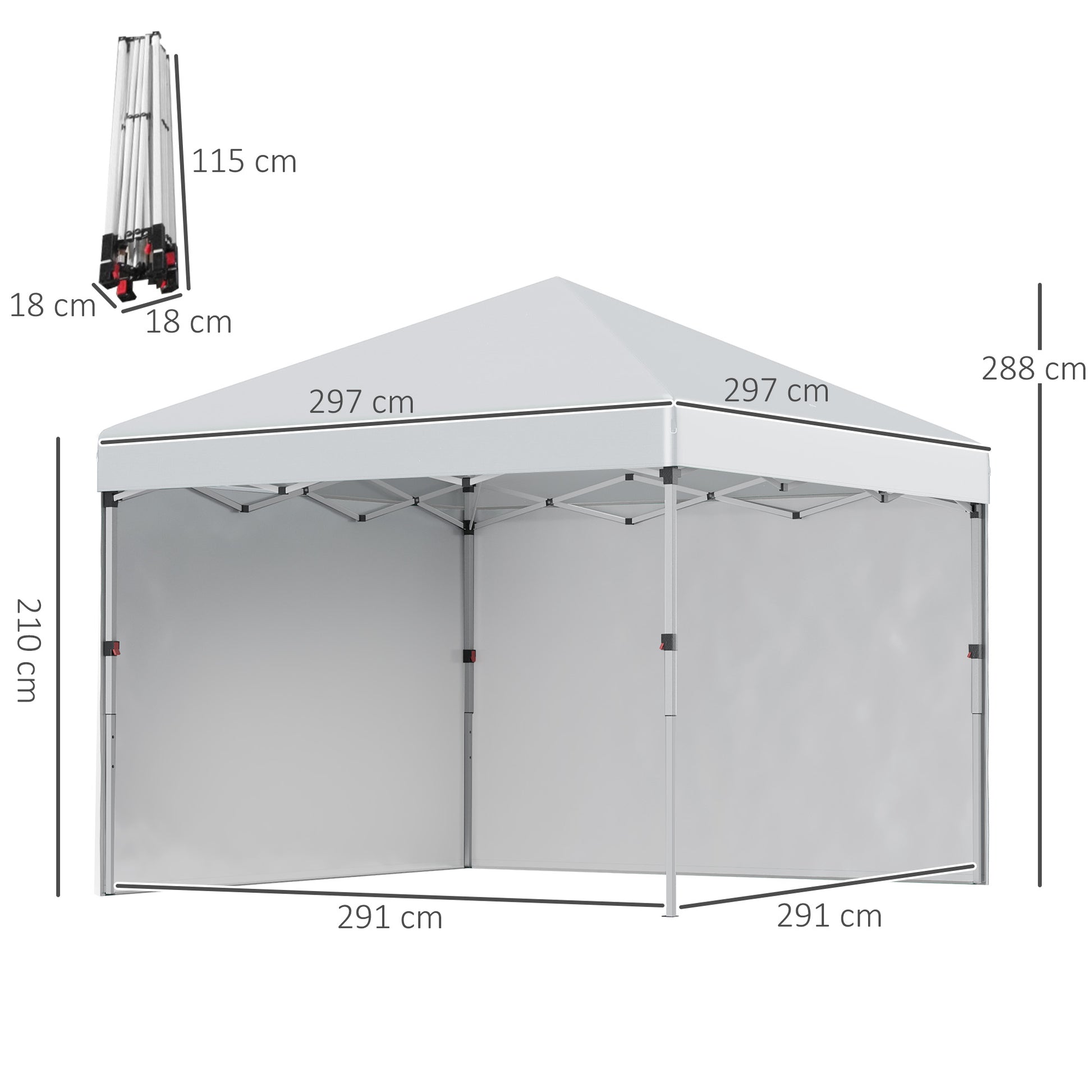 Overall dimensions: 297L x 297W x 288H cm. Never leave your shelter unattended. Dismantle it if severe weather is imminent. Always use both the supplied ground stakes and guy ropes when setting up your gazebo.