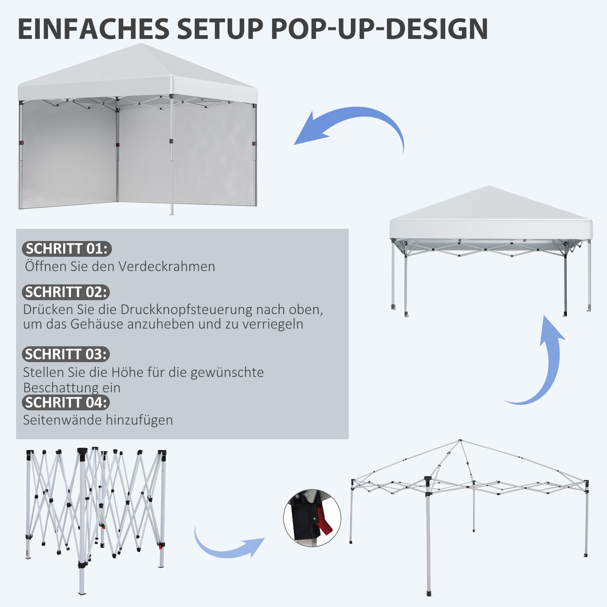 Easy setup & transport: Simply pull the pop-up gazebo upwards, drape the canopy over the frame, extend the legs, and you're done! Thanks to the foldable steel frame and carrying bag, the pop-up tent is also easy to store.