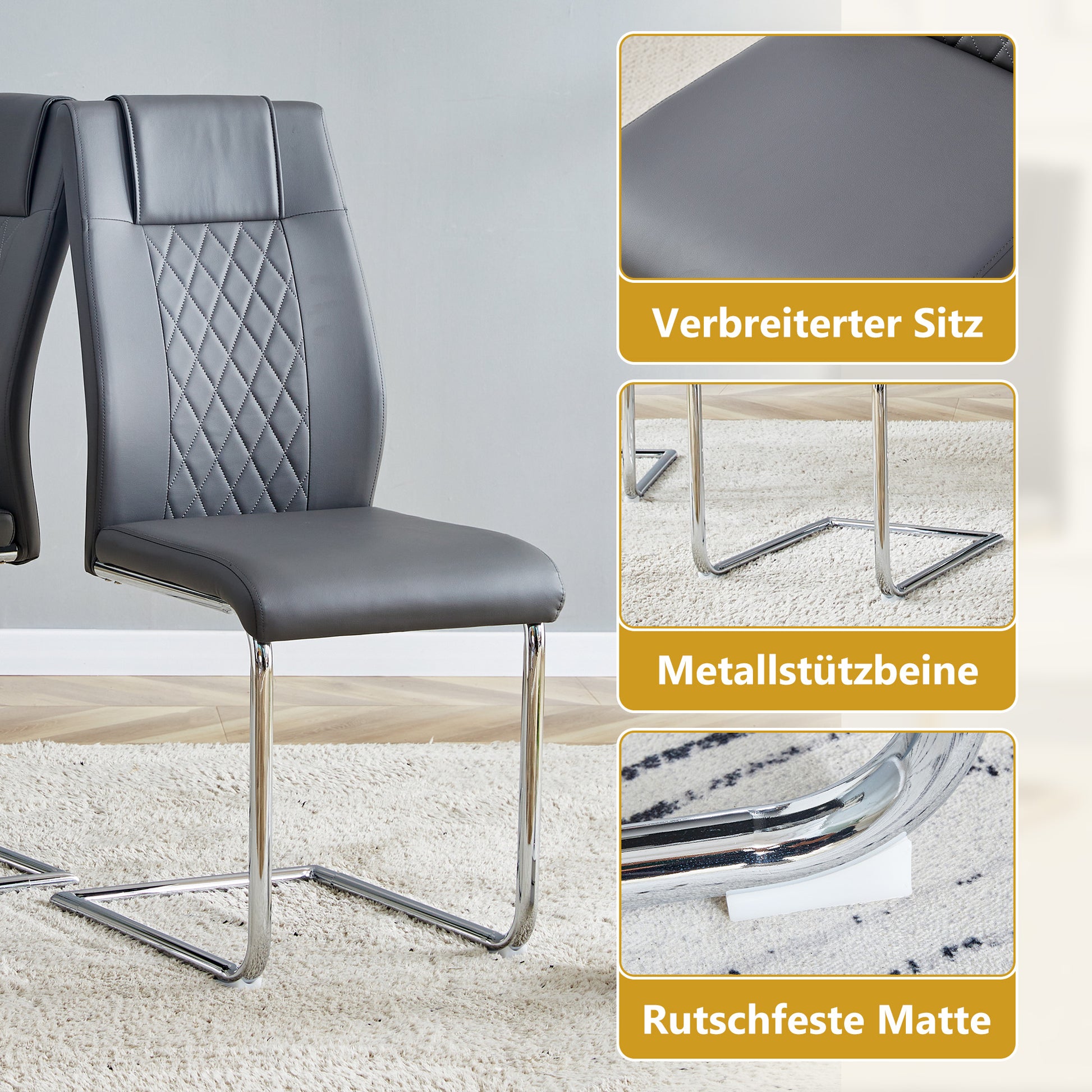 Sturdy construction. Silver metal legs ensure stability and a high load-bearing capacity (up to 120 kg per chair). These chairs are equipped with non-slip rubber feet for wood and tile floors.