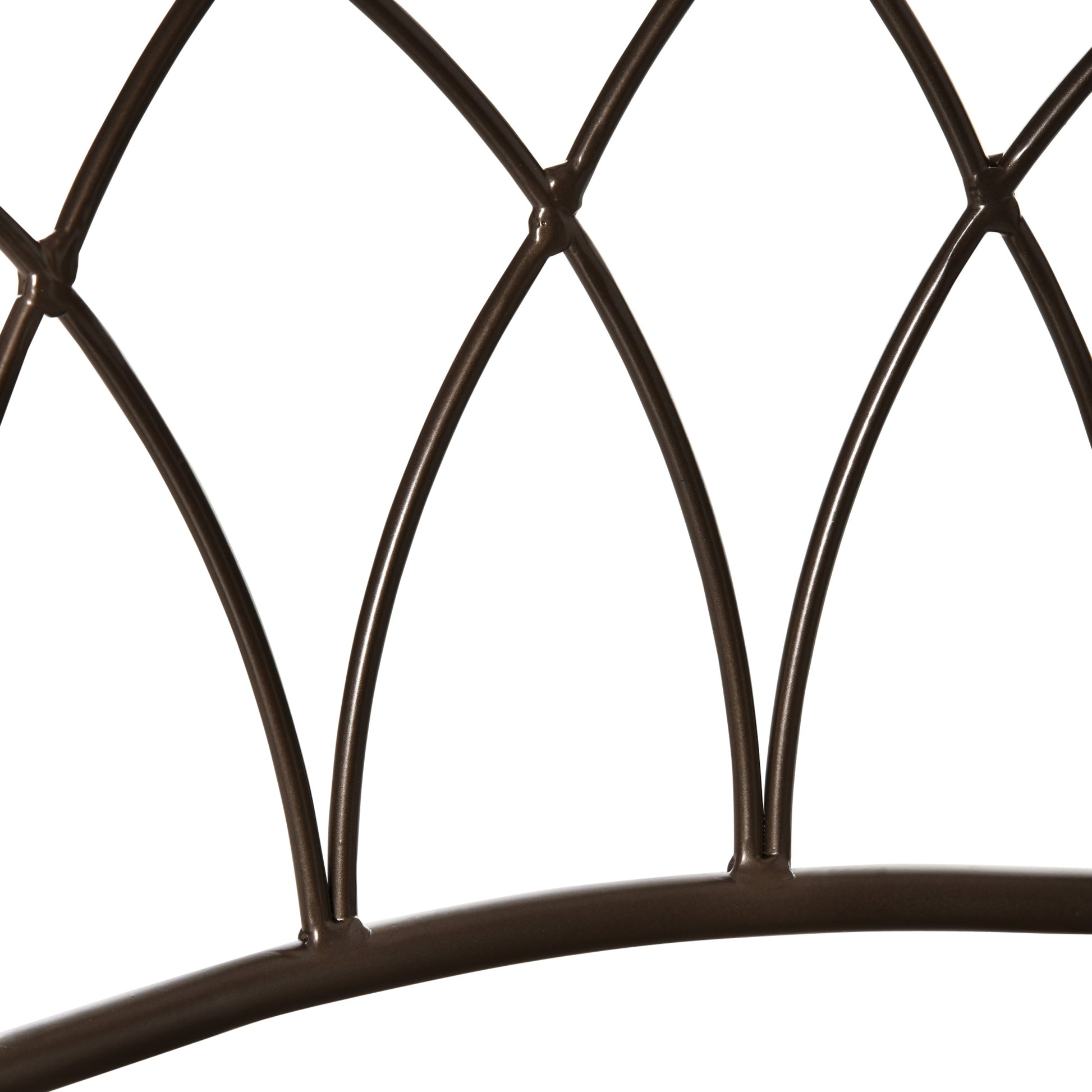 The vintage look features a rounded bottom half and a winged top filled with diamond webbing. The bronze-tone finish on the kitchen stool's metal frame adds a dash of sophistication.