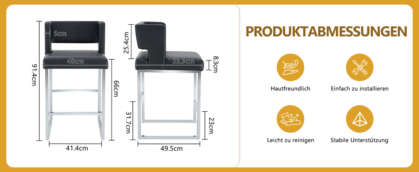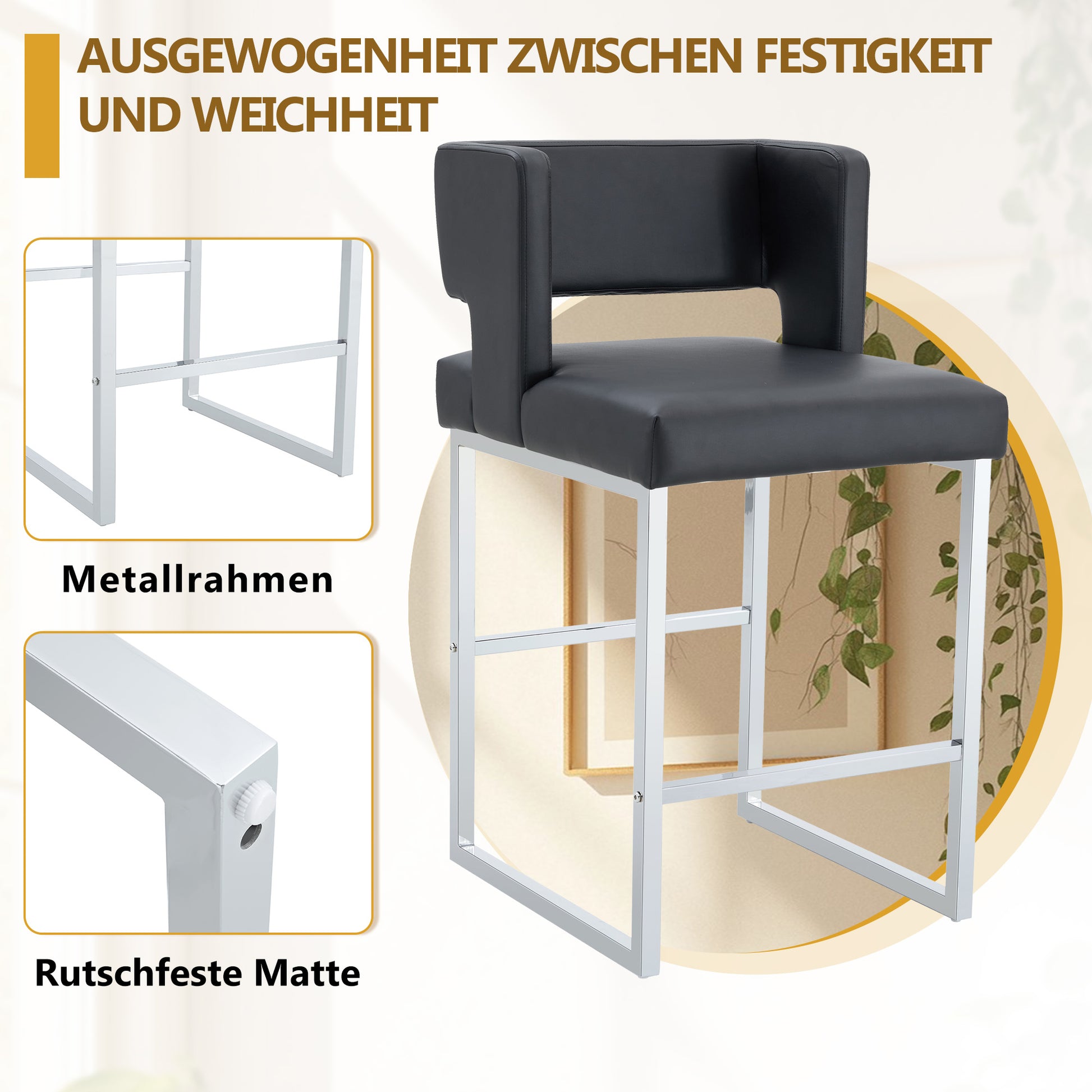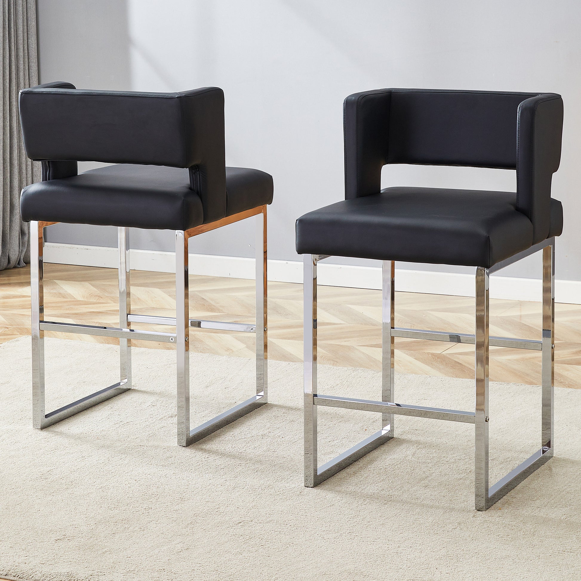 Set of 2 Bar Stools, Nordic Style Square Design Silver Metal Legs, Black