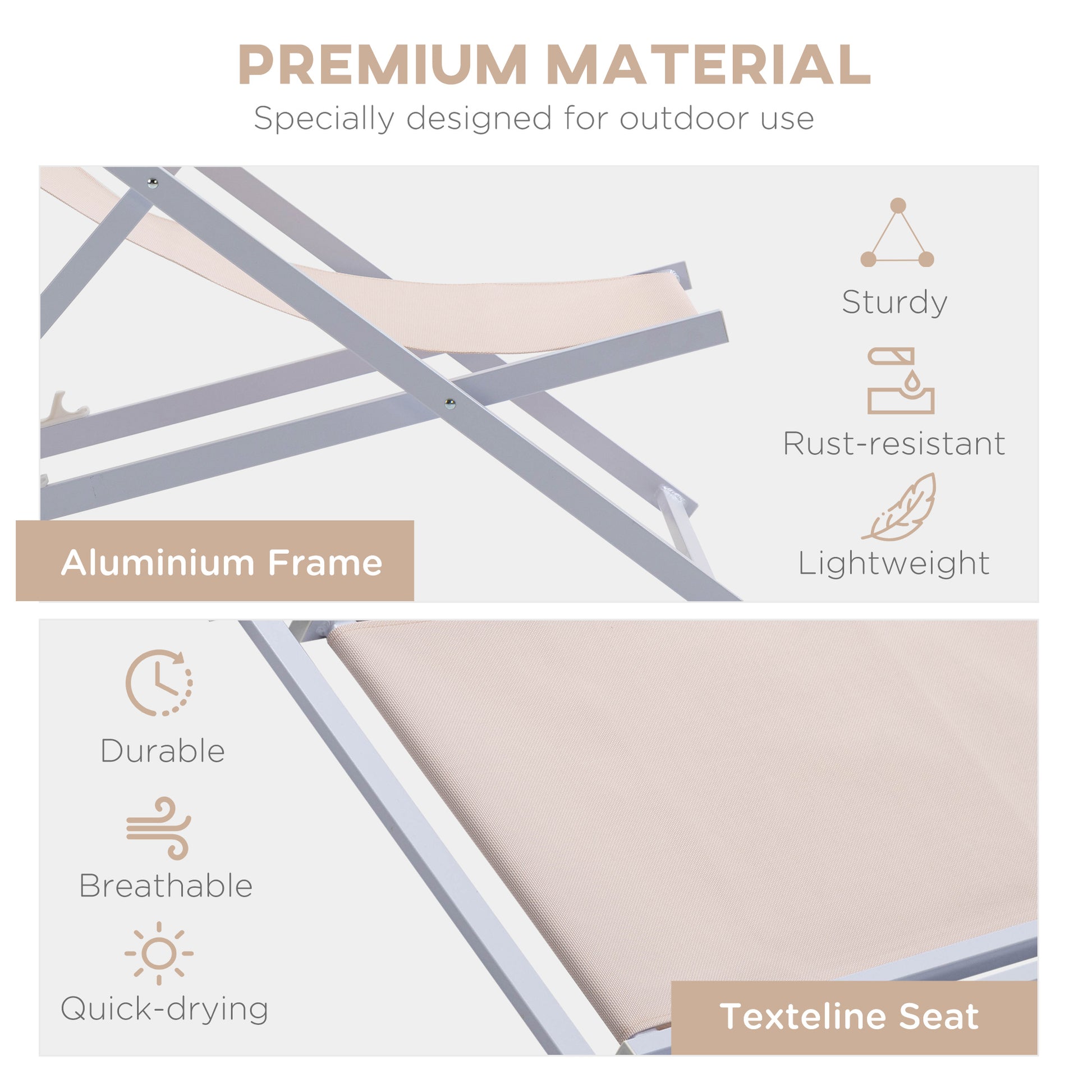 Set of 2 Folding Deck Chairs, Aluminum Frame Lounger, Beige