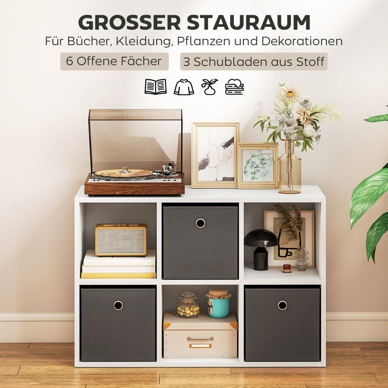 Equipped with 6 spacious storage cubes and 3 fabric drawers, this unit offers ideal conditions for neatly storing books, decorative items, or clothing, perfect for busy family areas or home offices.