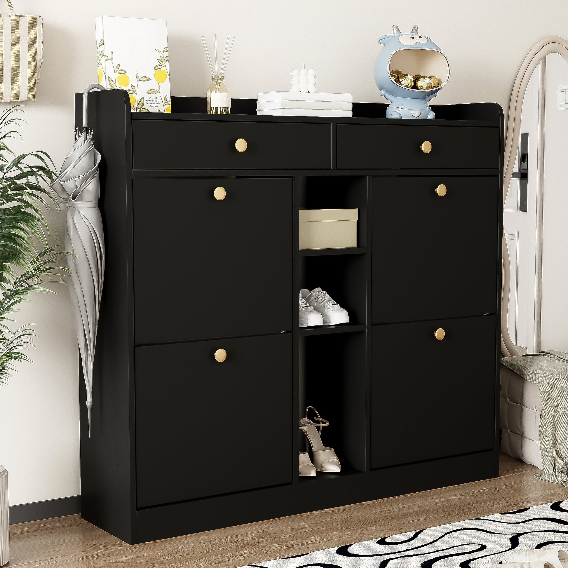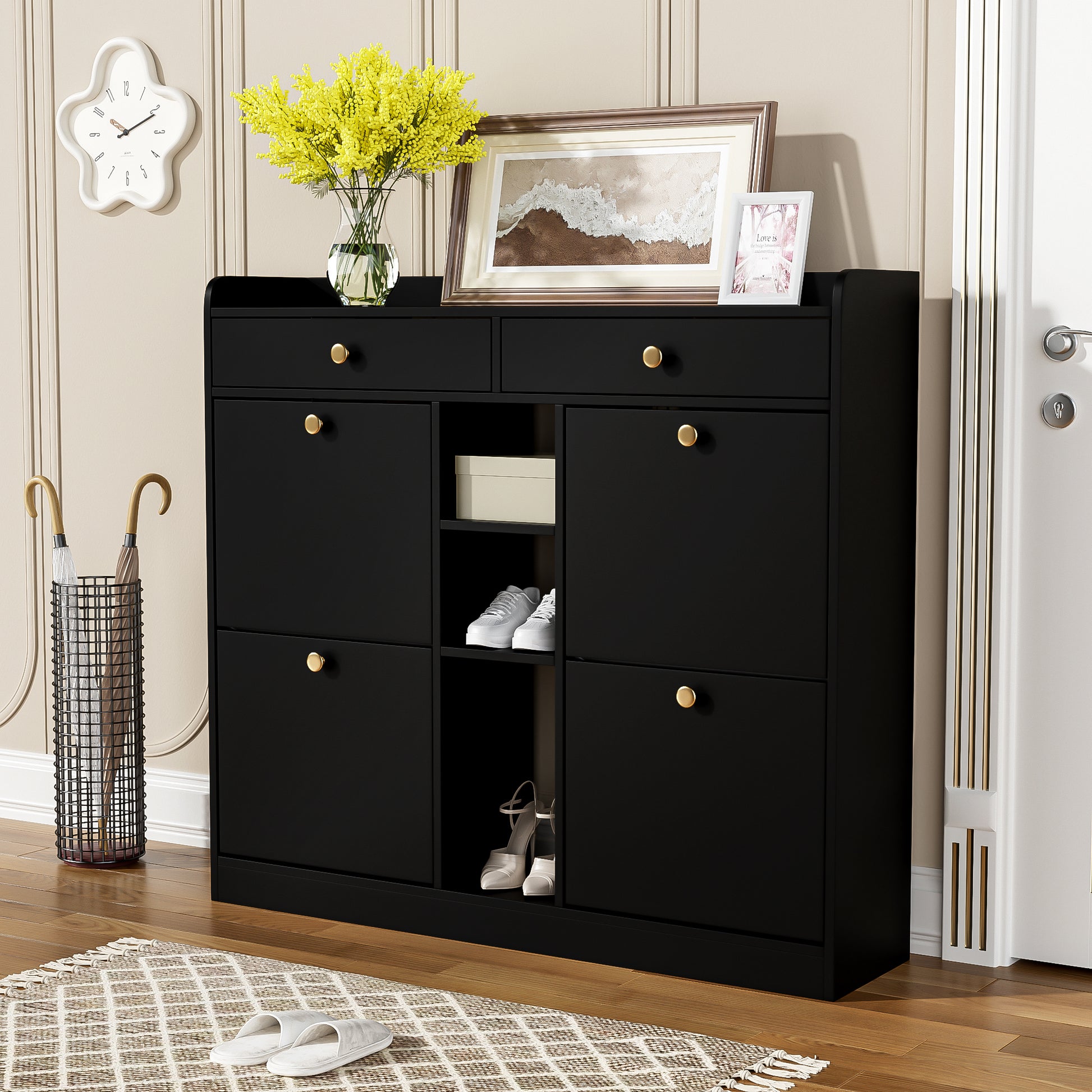 Shoe Cabinet, 4-Door, 2-Drawer, 3-Compartment, Black